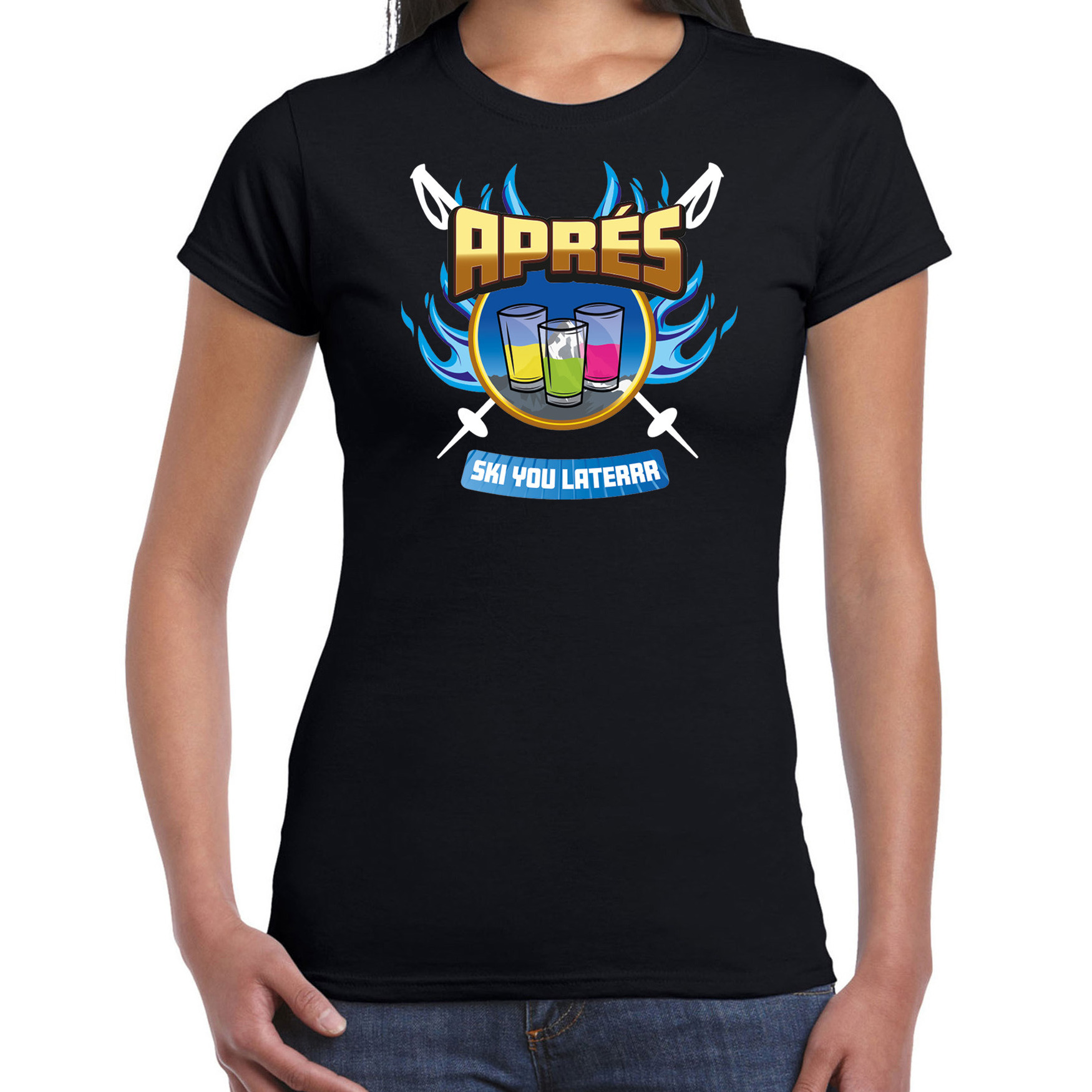 Fout wintersport verkleed t-shirt voor dames in de kleur zwart. Dit leuke t-shirt is bedrukt met de tekst: Apres ski you later! Trek het shirt aan op je volgende winter sport vakantie als je altijd in de Apres Skihut te vinden bent! De t-shirt is ook grappig om cadeau te geven aan jouw apres ski buddy. Uiteraard ook leuk om te dragen naar carnaval of een themafeest. Materiaal: 145 grams, 100% katoen. Merk: Bellatio Decorations.