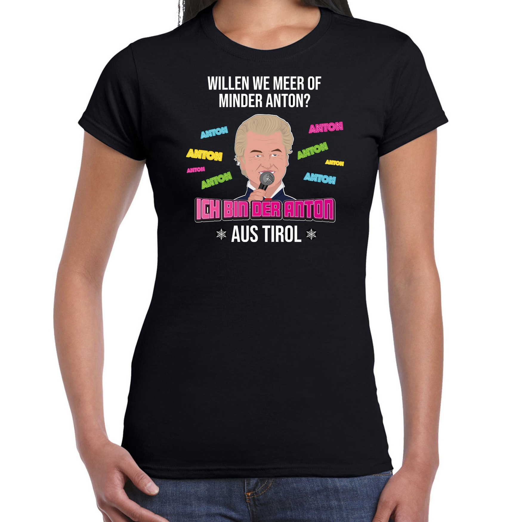 Fout wintersport verkleed t-shirt voor dames in de kleur zwart. Dit leuke t-shirt is bedrukt met de tekst: Willen we meer of minder Anton? Ich bin der Anton aus tirol. Met Geert Wilders en een microfoon. Trek dit shirt aan op je volgende winter sport vakantie als je altijd in de Apres Skihut te vinden bent! Het t-shirt is ook grappig om cadeau te geven aan jouw apres ski buddy. Uiteraard ook leuk om te dragen naar carnaval of een themafeest. Materiaal: 145 grams, 100% katoen. Merk: Bellatio Decorations.