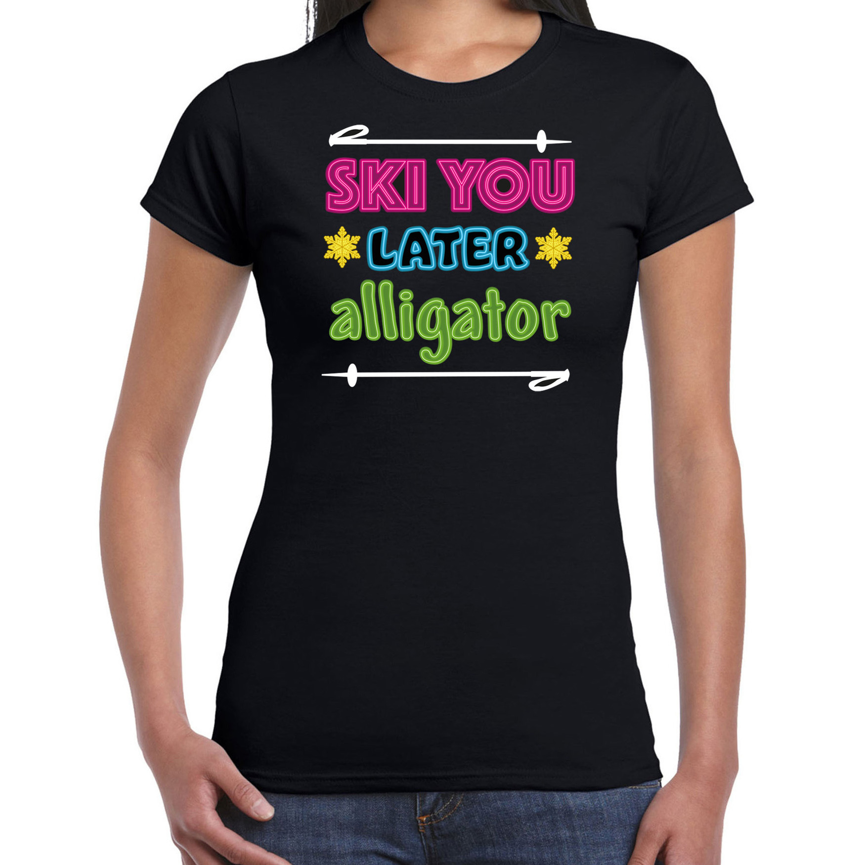 Fout wintersport verkleed t-shirt voor dames in de kleur zwart. Dit leuke t-shirt is bedrukt met de tekst: Ski you later alligator! in neonletters. Trek het shirt aan op je volgende winter sport vakantie als je altijd in de Apres Skihut te vinden bent! De t-shirt is ook grappig om cadeau te geven aan jouw apres ski buddy. Uiteraard ook leuk om te dragen naar carnaval of een themafeest. Materiaal: 145 grams, 100% katoen. Merk: Bellatio Decorations.