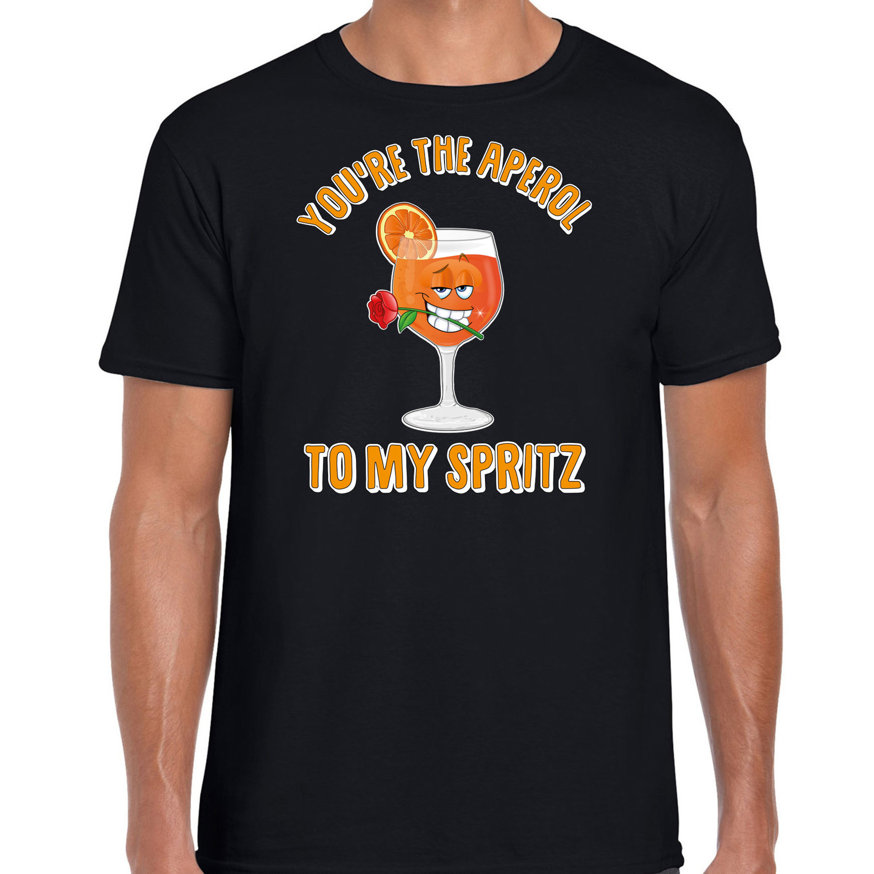 Fout wintersport verkleed t-shirt voor heren in de kleur zwart. Dit leuke t-shirt is bedrukt met de tekst: You’re the aperol to my spritz, en een flirterig glas aperol spritz met een roos. Trek het shirt aan op je volgende winter sport vakantie als je altijd in de Apres Skihut te vinden bent! Het t-shirt is ook grappig om cadeau te geven aan jouw apres ski buddy. Uiteraard ook leuk om te dragen naar carnaval of een themafeest. Materiaal: 145 grams, 100% katoen. Merk: Bellatio Decorations.