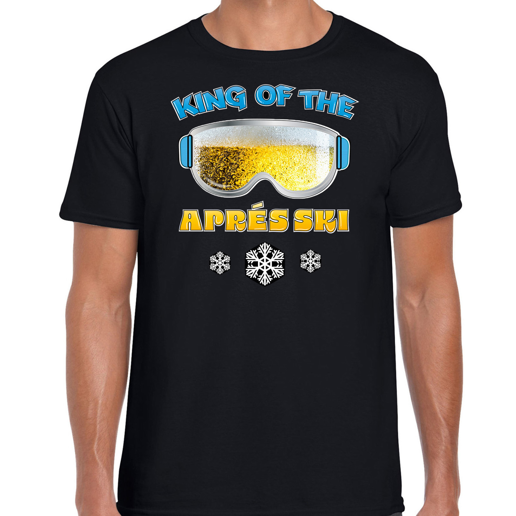 Fout wintersport verkleed t-shirt voor heren in de kleur zwart. Dit leuke shirt is bedrukt met de tekst: King of the apres ski. Daarbij getekend een skibril gevuld met bier. Trek dit shirt aan bij de apres ski op je volgende winter sport vakantie! Materiaal: 145 grams, 100% katoen. Merk: Bellatio Decorations.