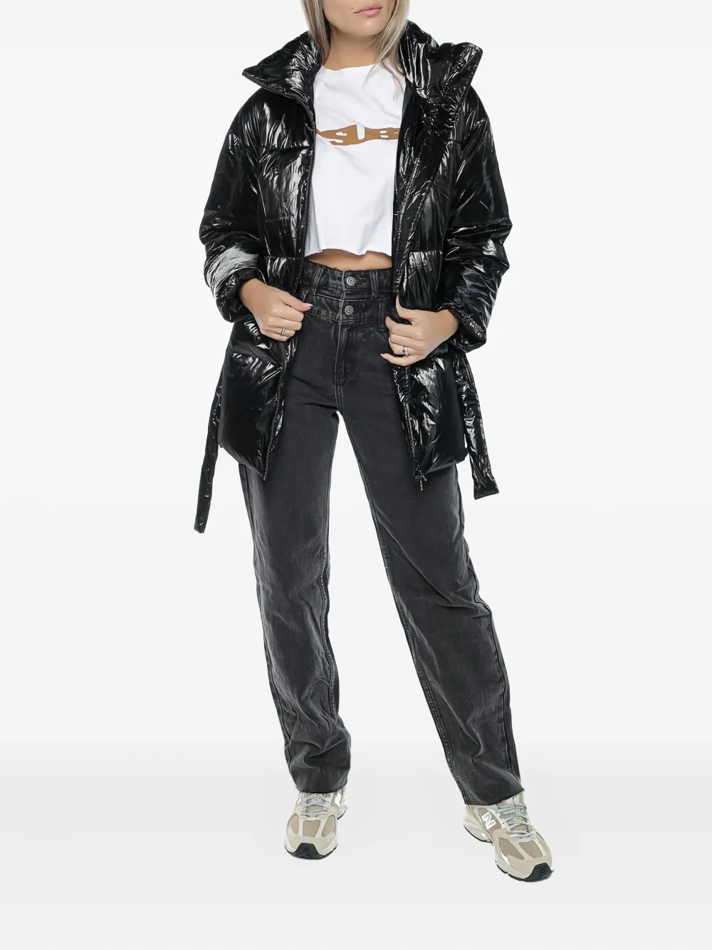 zwart hoge hals gewatteerd design taille met ceintuur glanzende finish verfraaide knopen