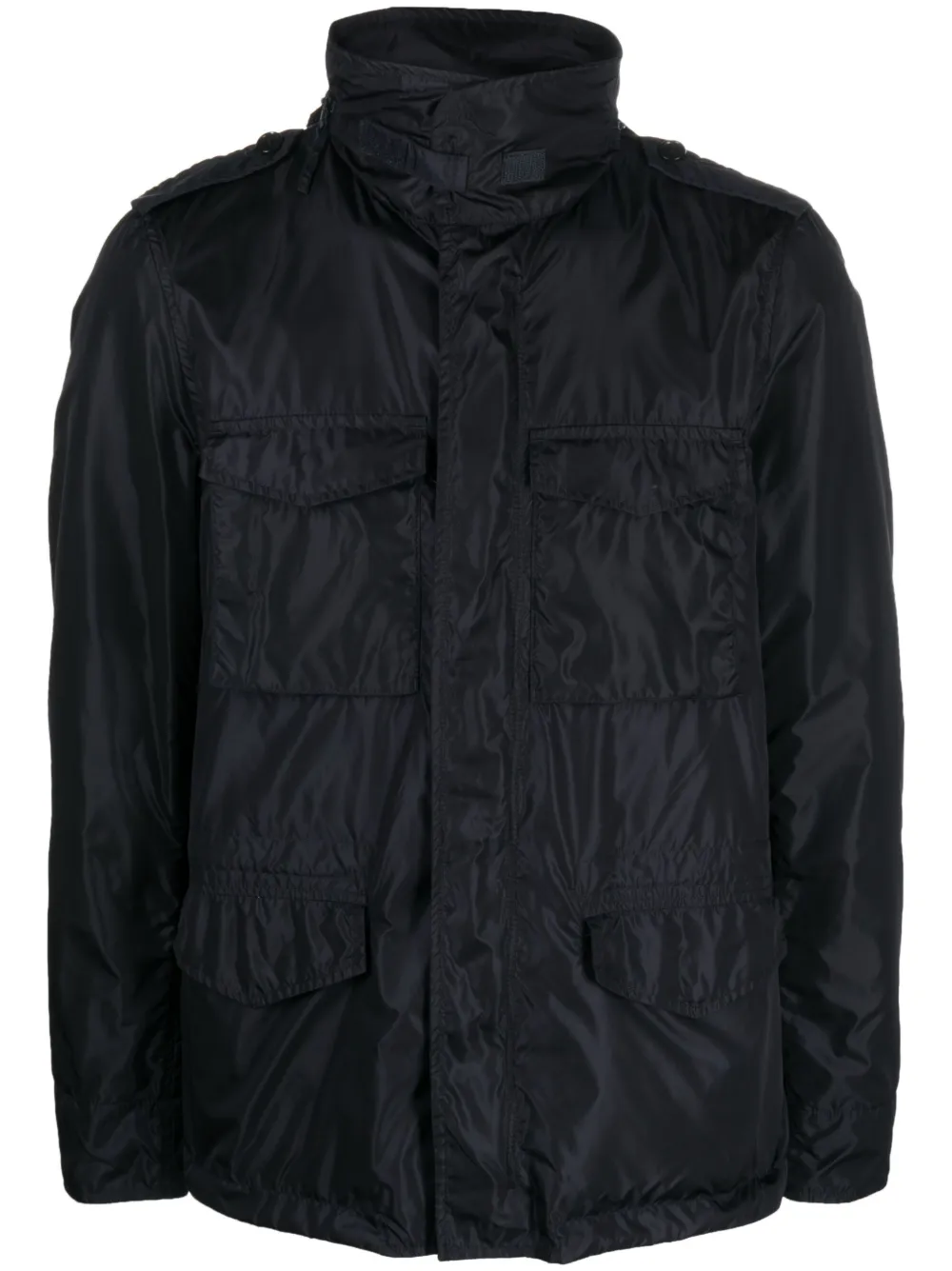 Bleu nuit, étanche, capuche dissimulée, col montant, bouton pression et fermeture zippée sur le devant, épaulettes, manches longues, poches devant à rabat, ourlet à lien de resserrage.