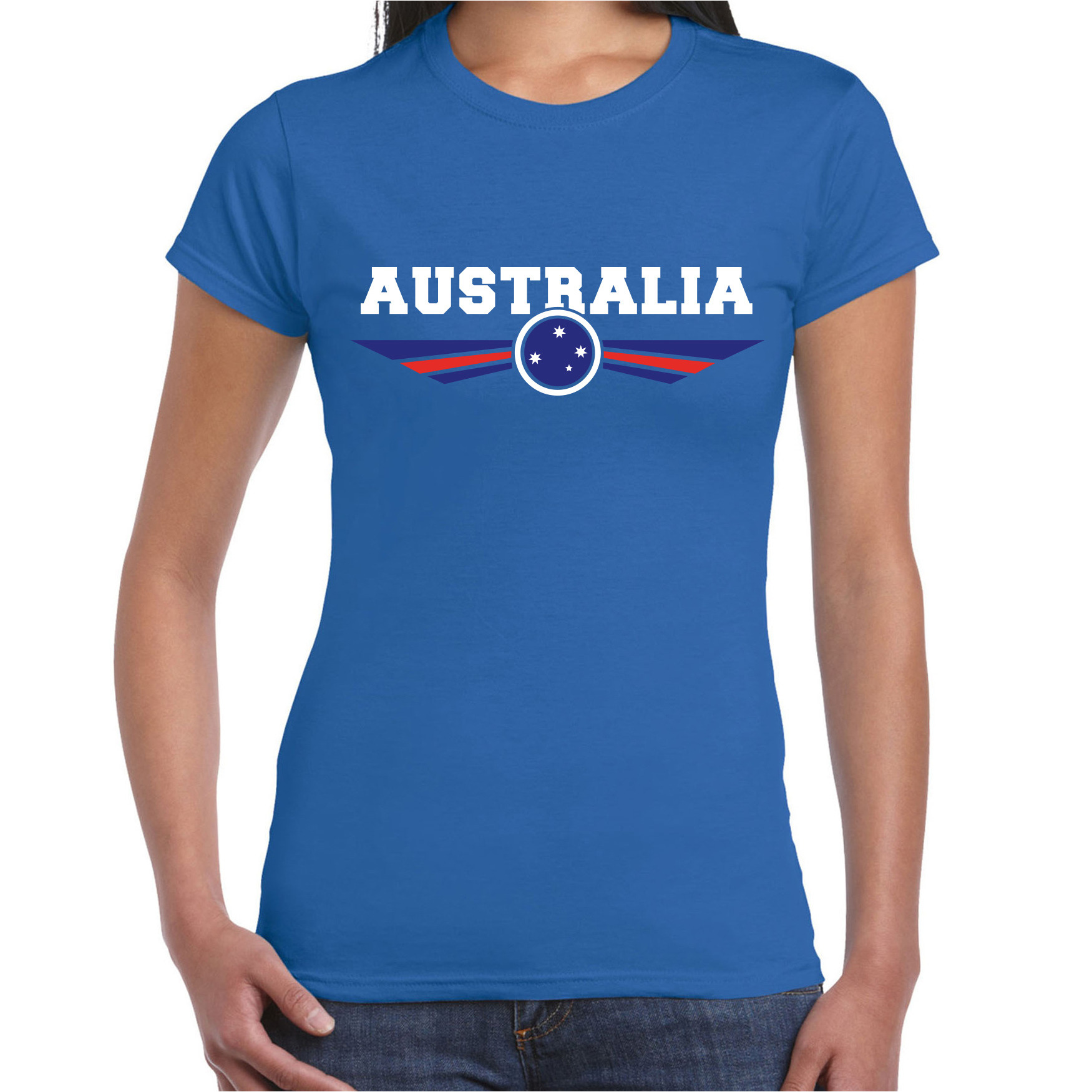 Australie / Australia landen t-shirt blauw voor dames. Op dit blauwe shirt met wapen staat in grote letters de tekst: AUSTRALIA. Het wapen heeft de kleuren van de Australische vlag!