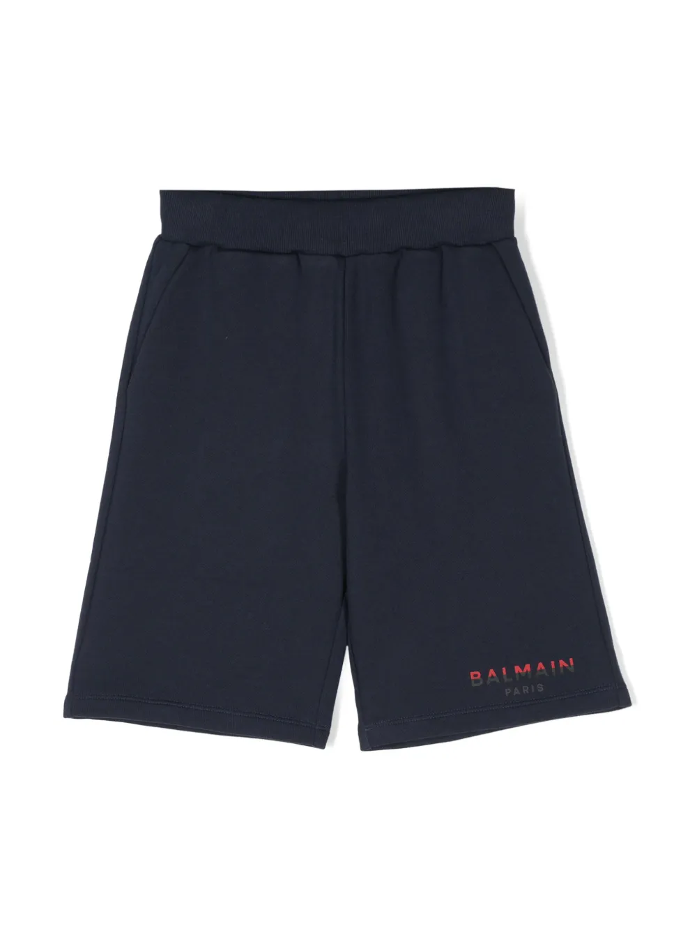 bleu marine coton texture jersey poches latérales fendues logo imprimé sur la cuisse longueur genou doublure en éponge ceinture élastique