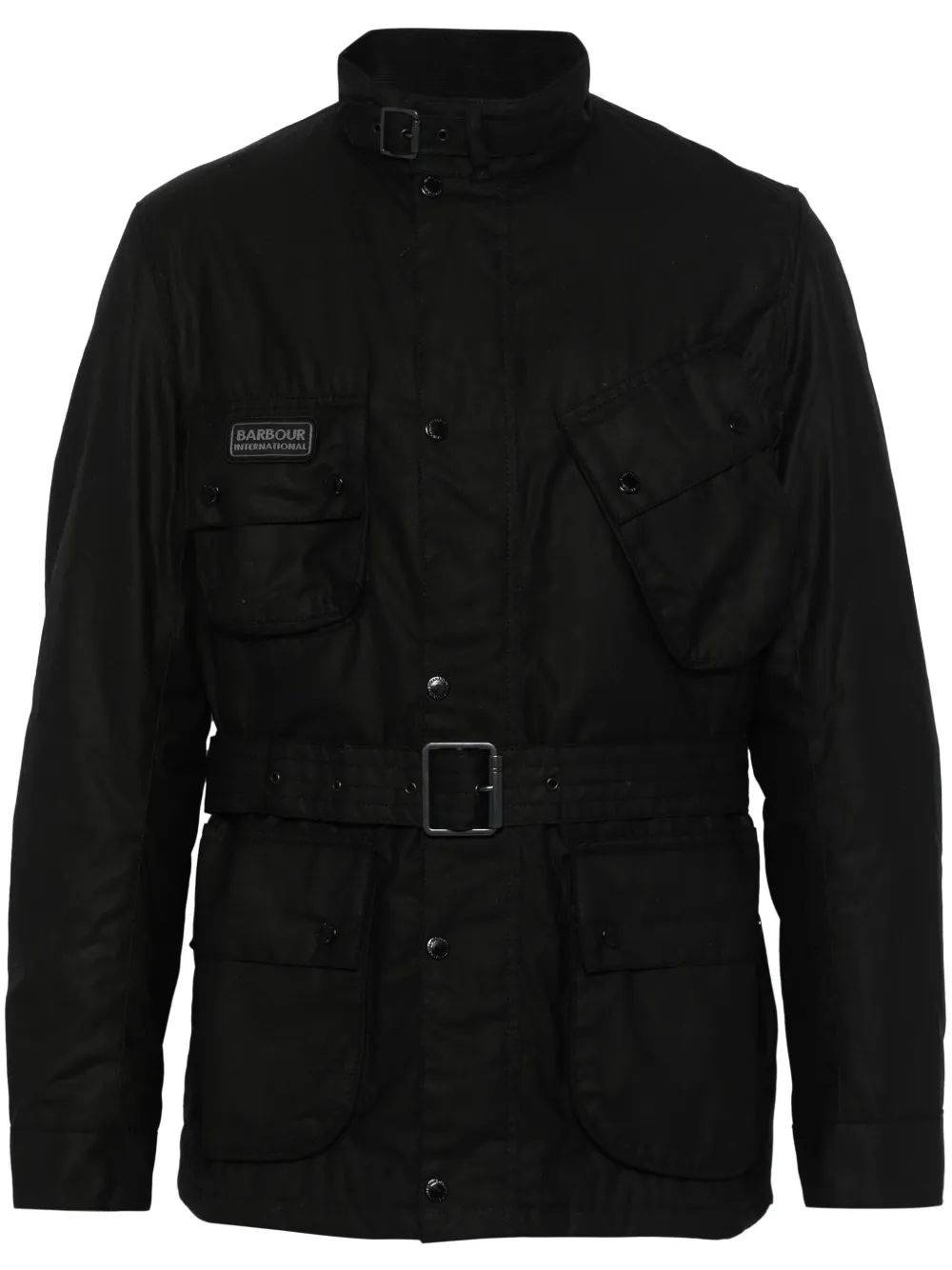 noir coton enduit ciré bouton pression et fermeture zippée sur le devant col à fermeture à boucle manches longues poignets à boutons pression patch poitrine à logo deux poches poitrine à rabat deux poches plaquées sur le devant ceinture ajustable et détachable doublure matelassée ourlet droit