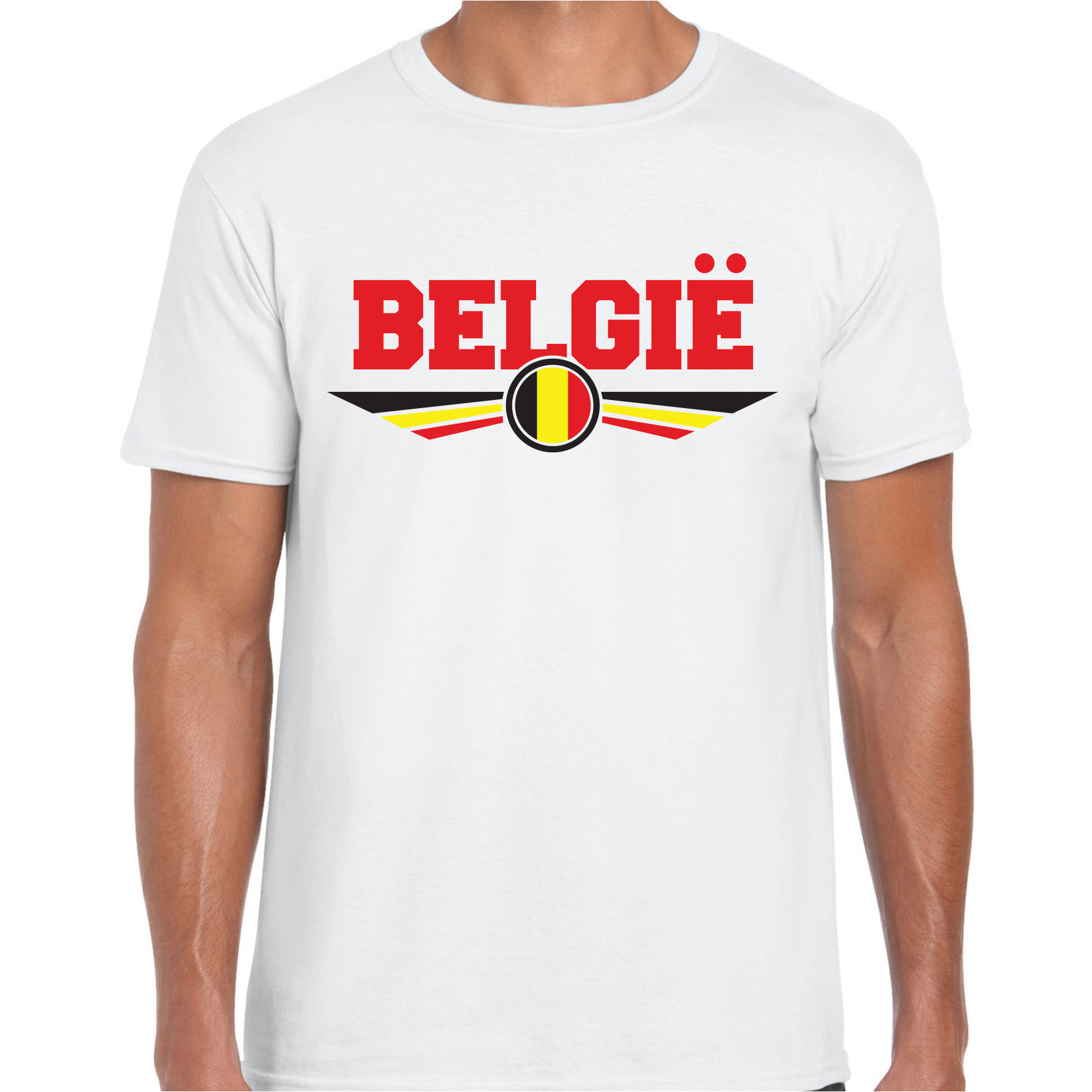 Belgie landen t-shirt wit voor heren. Op dit wite shirt met wapen staat in grote letters de tekst: BELGIE. Het wapen heeft de kleuren van de Belgische vlag!
