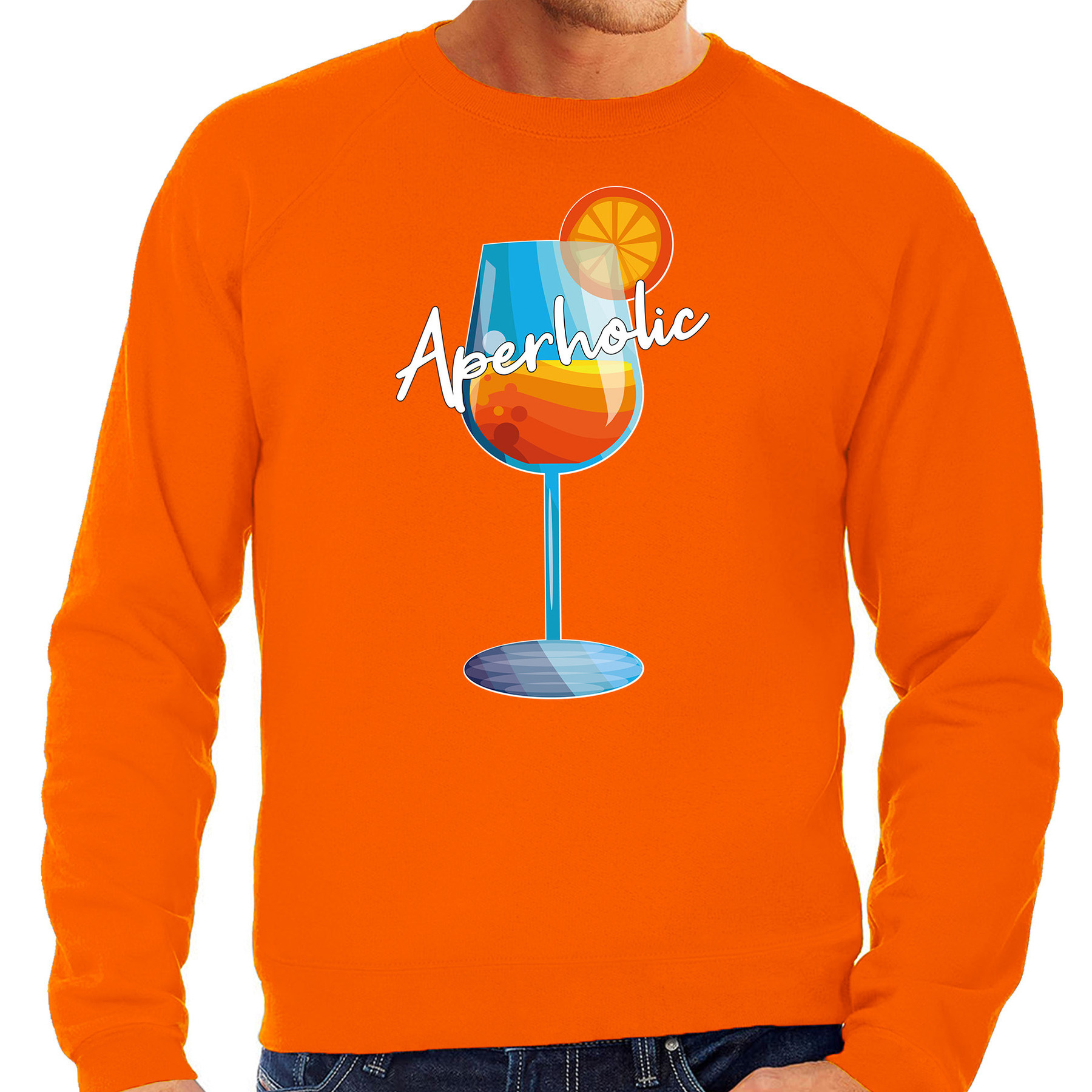 Wintersport verkleed sweater voor heren in de kleur oranje. Maak je klaar voor de apr?s-ski met deze grappige sweater, compleet met een speelse cocktail van Aperol print met de tekst, “Aperholic”. Perfect om te dragen na een dag snowboarden of ski?n, deze sweater is een knipoog naar het feestfestijn dat op je wacht. Comfortabel en warm, ideaal voor koude winteravonden en natuurlijk om de apr?s-ski sfeer levendig te houden. Trek deze leuke trui aan op je volgende winter sport vakantie als je altijd in de Apr?s Skihut te vinden bent! De sweater is ook grappig om cadeau te geven aan jouw Apr?s ski buddy. Uiteraard ook leuk om te dragen naar carnaval of een themafeest. Materiaal: 80% katoen/20% polyester, 240 grams kwaliteit. Merk: Bellatio Decorations.