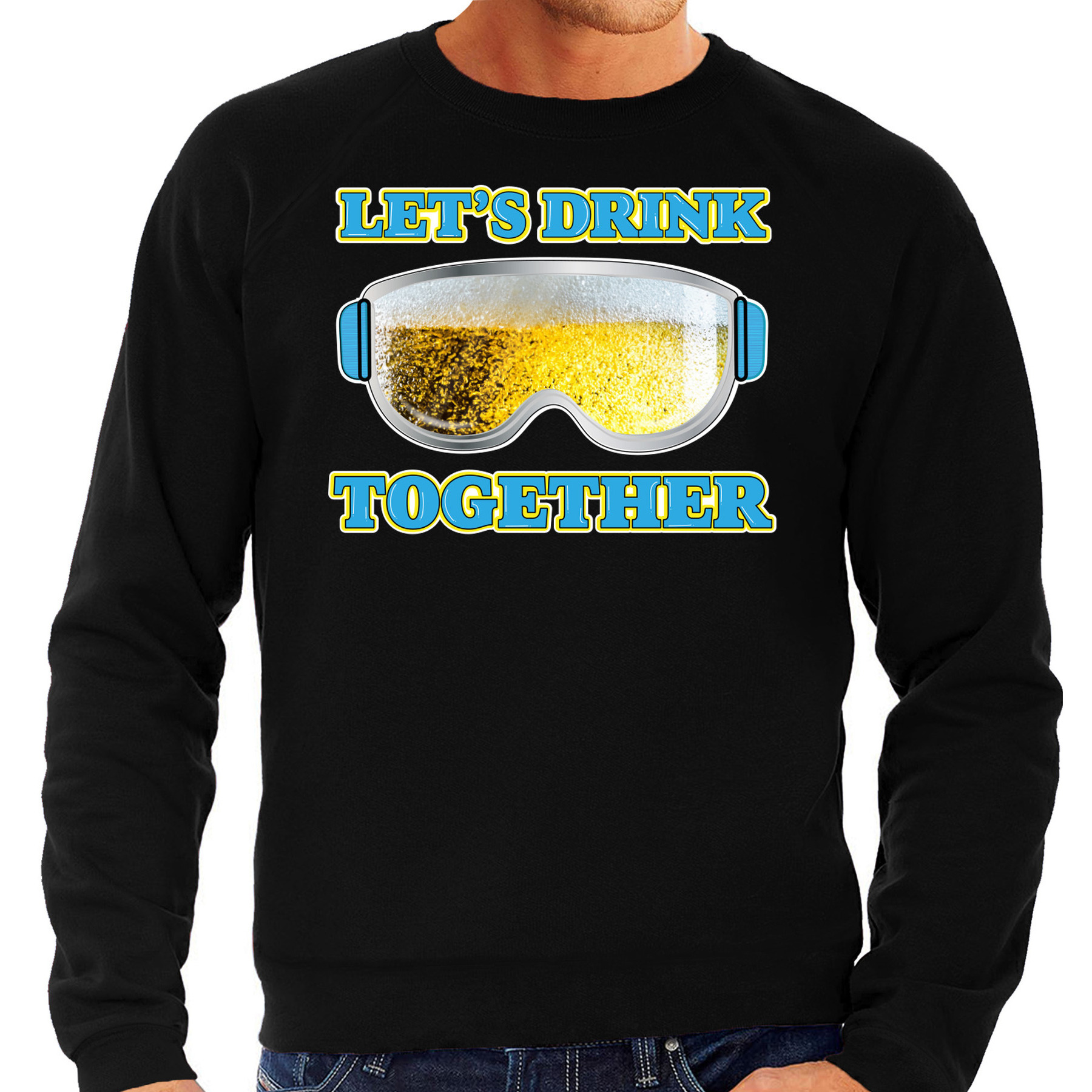 Foute wintersport verkleed sweater voor heren in de kleur zwart. Deze leuke trui is bedrukt met de tekst: Let’s Drink Together, en een afbeelding van een skibril gevuld met bier. Trek deze trui aan op je volgende winter sport vakantie als je altijd in de Apres Skihut te vinden bent! De sweater is ook grappig om cadeau te geven aan jouw apres ski buddy. Uiteraard ook leuk om te dragen naar carnaval of een themafeest. Materiaal: 80% katoen/20% polyester, 240 grams kwaliteit. Merk: Bellatio Decorations.
