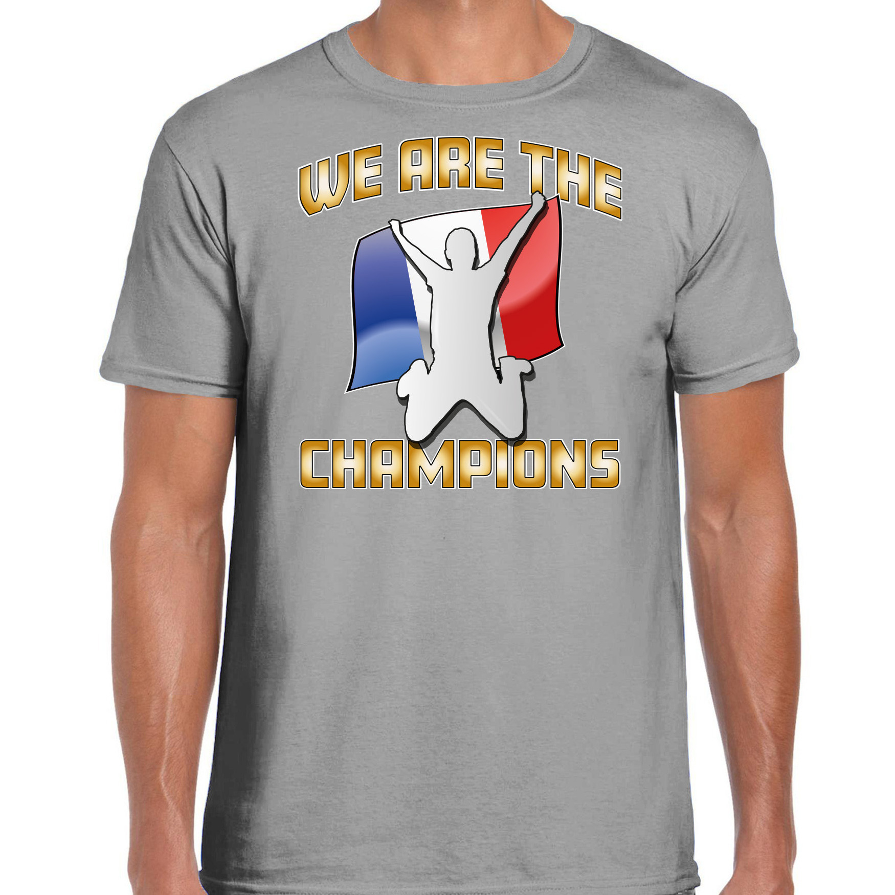 Verkleed T-shirt voor heren in de kleur grijs. Het shirt is bedrukt met de tekst: We are the champions! Met de vlag van Frankrijk. Heb je binnenkort een voetbal wedstrijd of een ander sport evenement waarbij je Frankrijk wil aanmoedigen? Dan is dit bedrukte T-shirt de perfecte keuze! Support Frankrijk met dit leuke bedrukte shirt. Ook leuk om te dragen naar een themafeestje of gewoon zomaar. Materiaal: 145 grams, 100% katoen. Merk: Bellatio Decorations.