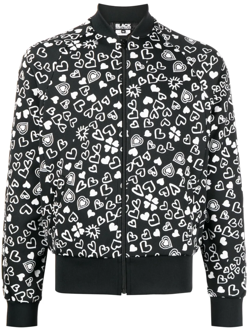 Noir/blanc, imprimé à cœurs, col montant, fermeture zippée devant, manches longues, deux poches latérales fendues, ourlet droit.