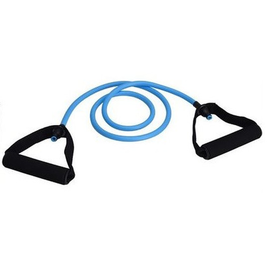 Blauw sportelastiek/weerstandsband fitnessartikelen. Met dit elastiek kun je heel veel verschillende oefeningen doen. Je kunt je handen of voeten in de lussen doen en hier veel verschillende spiergroepen mee trainen. Je lichaam in vorm/shape brengen door te trainen vanuit huis met je eigen sportattributen. Deze elastiek heeft een medium weerstand. Wij hebben ook elastieken met minder weerstand in ons assortiment.