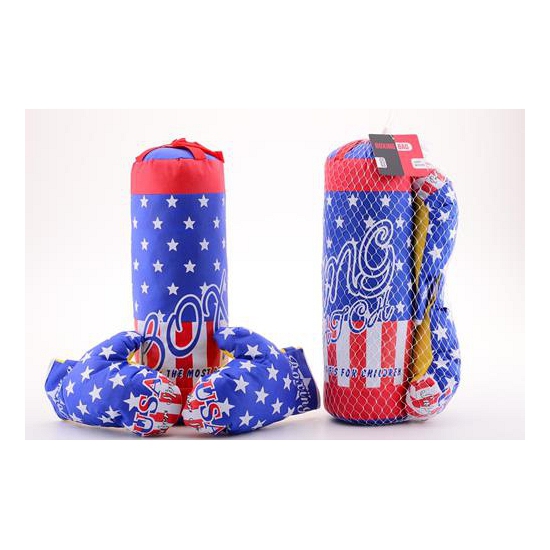 Bokszak met handschoenen. Boks set met handschoenen wordt geleverd met 1 bokszak en 1 paar handschoenen in de stijl van de Amerikaanse vlag. De zak is ca. 44 cm hoog en 13.5 cm breed. Geschikt voor kinderen van ca. 8 t/m 12 jaar.