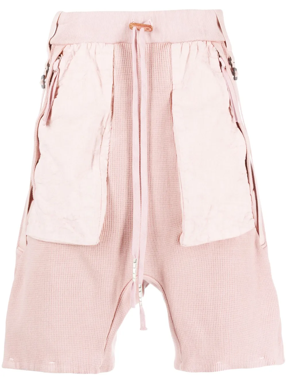 Rose poudré, coton et lyocell mélangés, design patchwork, tricot gaufré, taille élastique à lien de resserrage, entrejambe sarouel, deux poches latérales zippées, deux poches arrière zippées, hauteur genou.