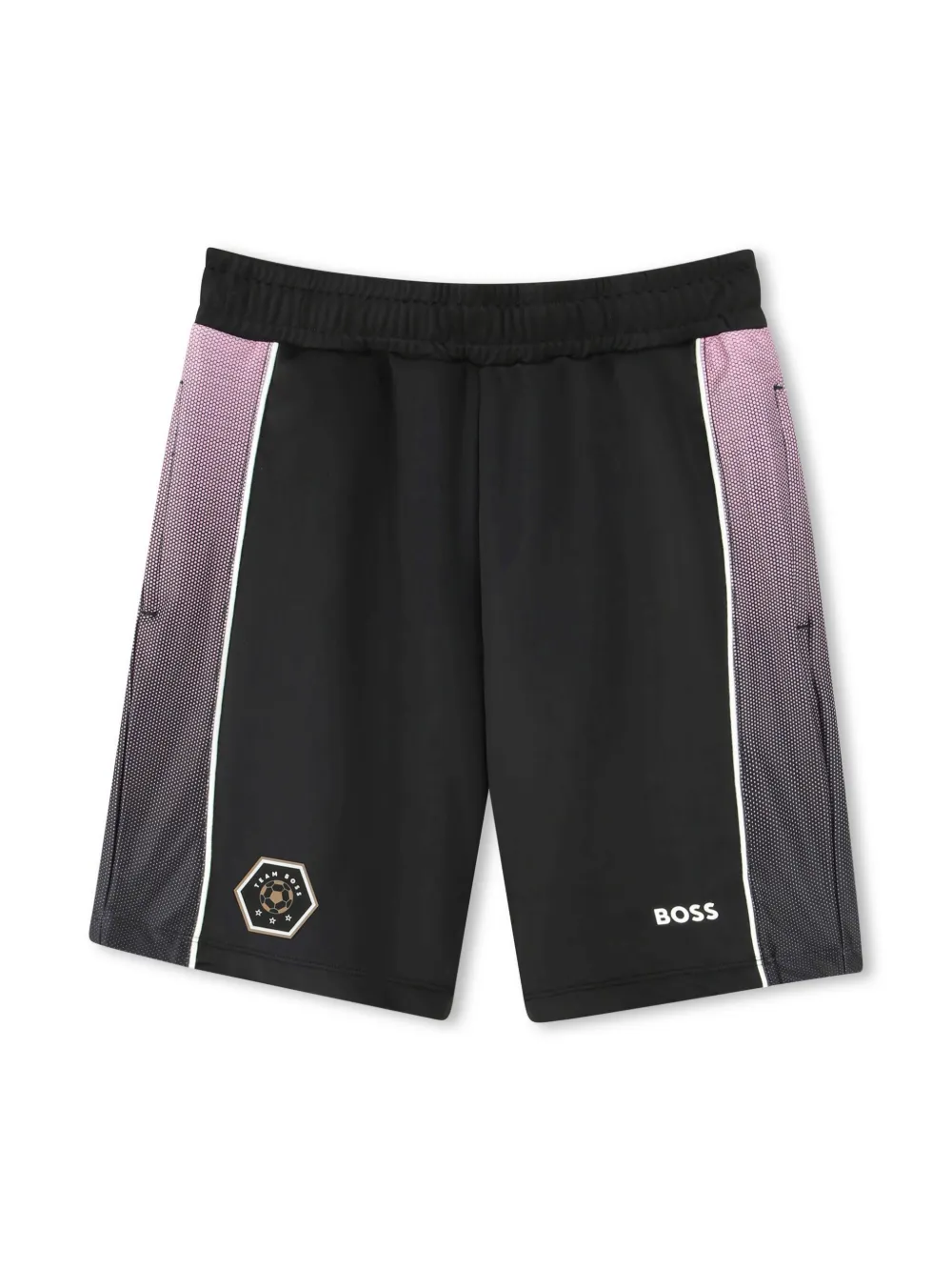 noir/violet jersey stretch design à empiècements ceinture élastique deux poches latérales passepoilées appliqué logo logo imprimé sur la cuisse longueur genou