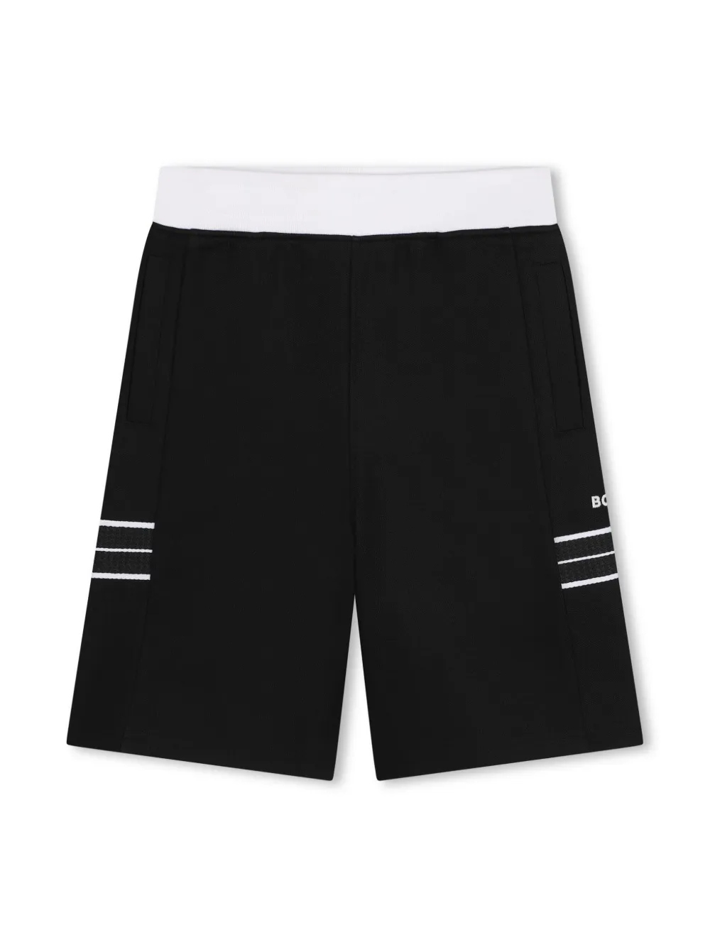 noir/blanc coton mélangé texture jersey rayures latérales logo imprimé sur la cuisse ceinture élastique deux poches latérales passepoilées coupe droite