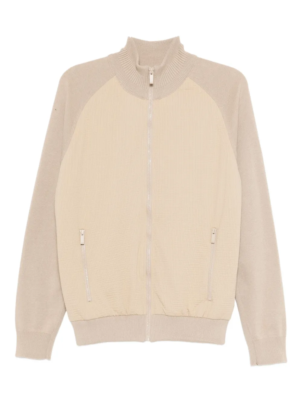 beige clair fermeture zippée avant deux poches zippées manches raglan longues poignets et bords côtelés