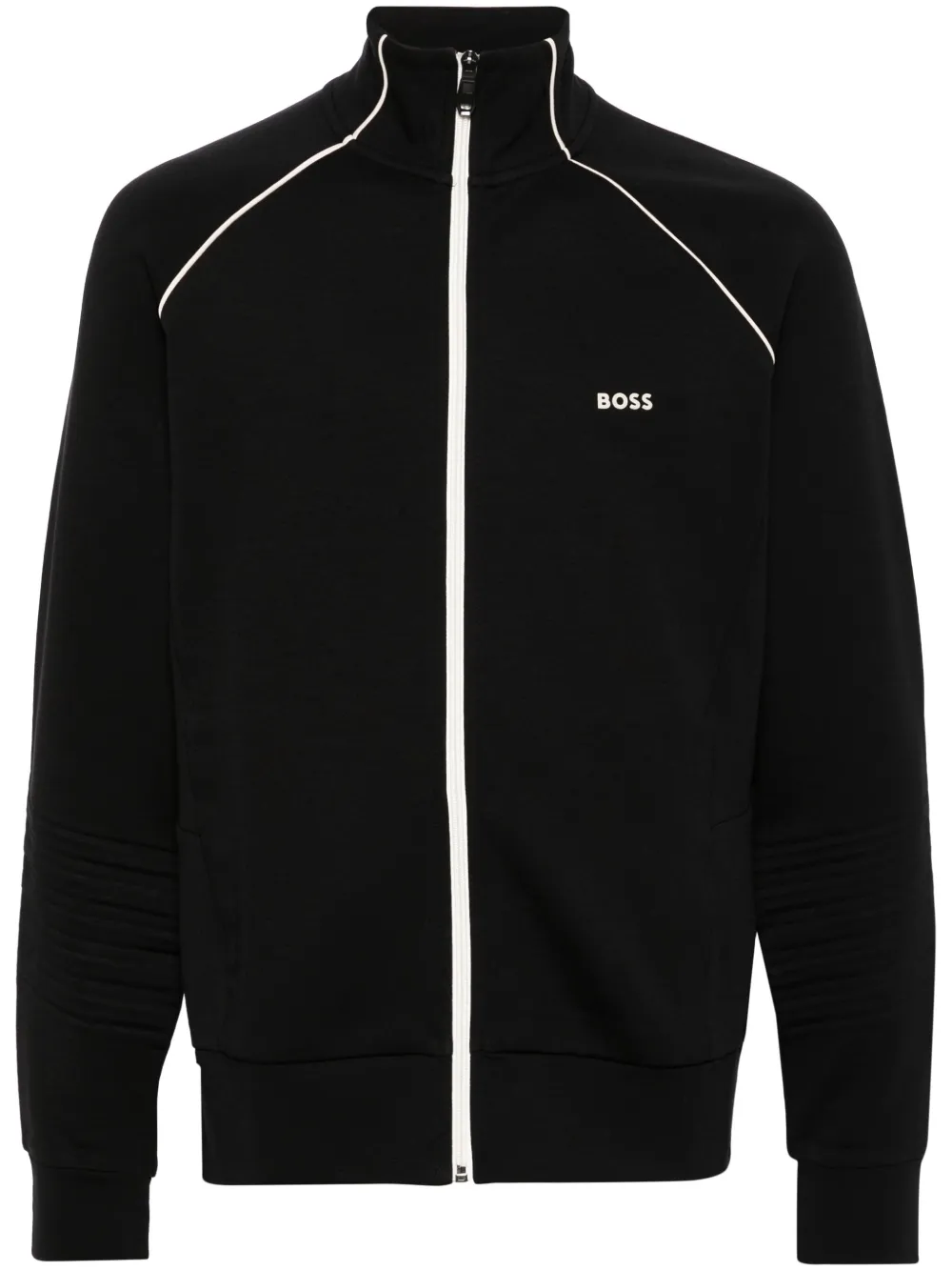 noir coton mélangé tissu néoprene détails passepoilés détail de logo en relief col montant fermeture zippée devant manches raglan longues poignets élastiqués deux poches latérales zippées ourlet droit