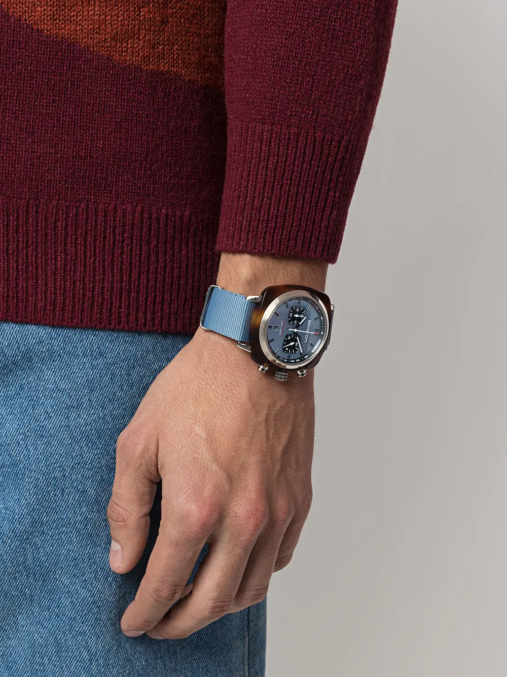 Quartz uurwerk, ronde wijzerplaat, roestvrijstalen kast, uren, minuten en seconden, stopwatchfunctie, index wijzerplaat, datumaanduiding, NATO bandje en gespsluiting.