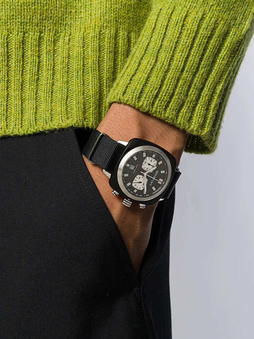 Clubmaster Sport horloge van BRISTON WATCHES voorzien van ronde wijzerplaat, automatisch uurwerk, roestvrijstalen kast en verstelbare pasvorm.