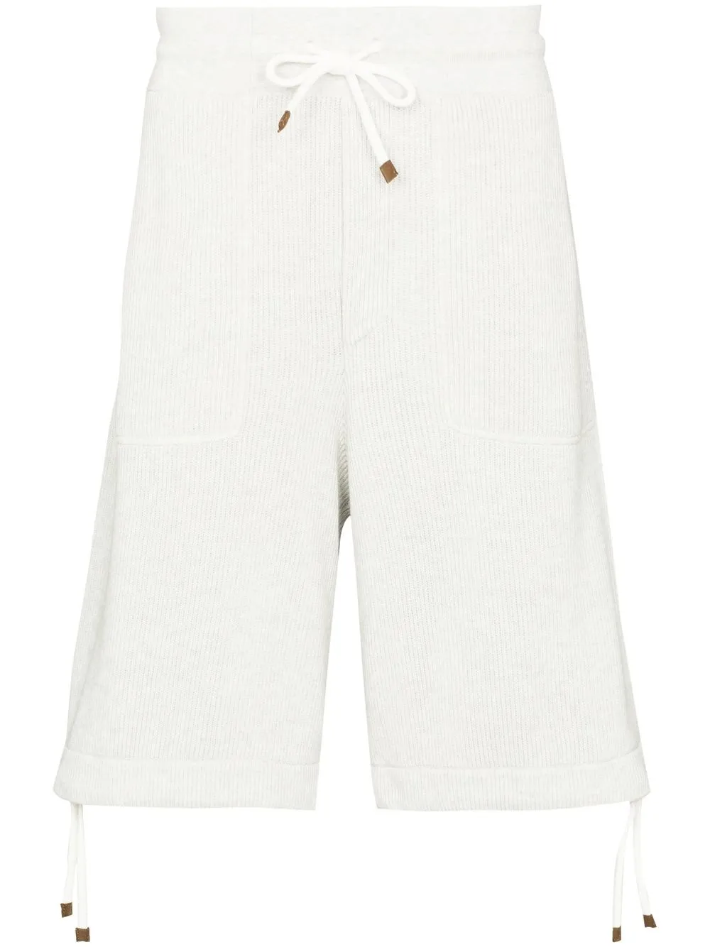 Gris clair, coton, maille nervurée, taille élastique à lien de resserrage, deux poches latérales plaquées, poches arrière plaquées, hauteur genou, ourlet à lien de resserrage.