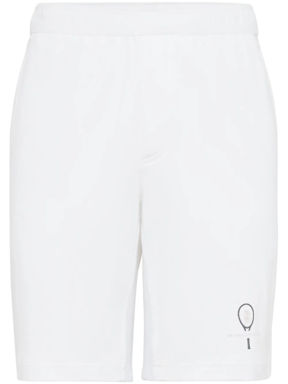 blanc coton logo brodé sur le côté ceinture élastique poches latérales fendues poche arrière passepoilée longueur genou