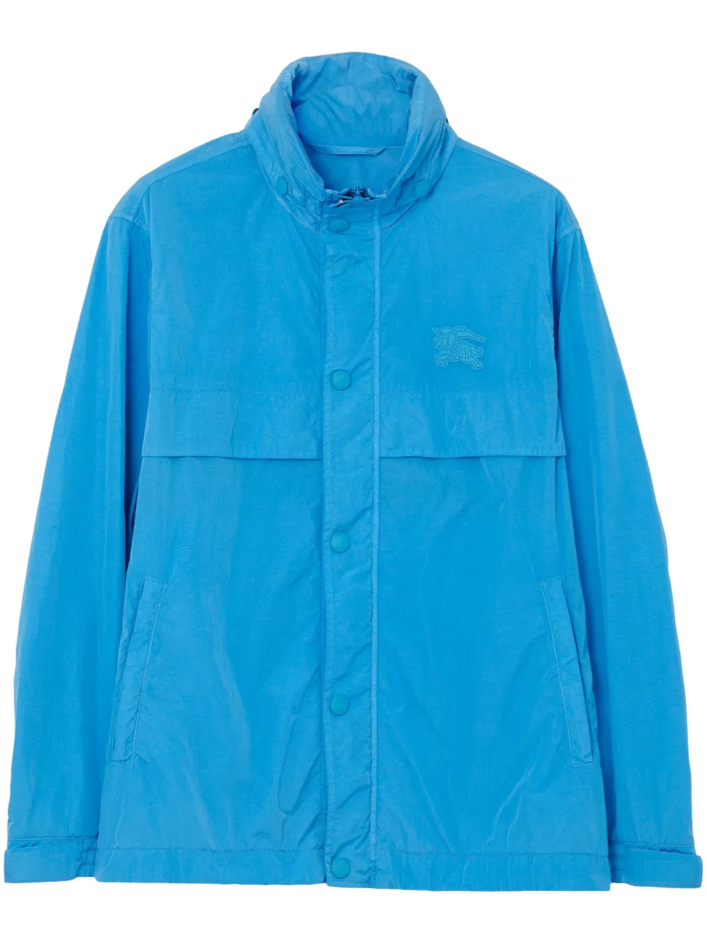 Bleu, col cheminée, capuche dissimulée, fermeture à boutons pression sur le devant, motif Chevalier Équestre signature, deux poches passepoilées latérales, manches longues, poignets à fermeture scratch, ourlet à lien de resserrage.