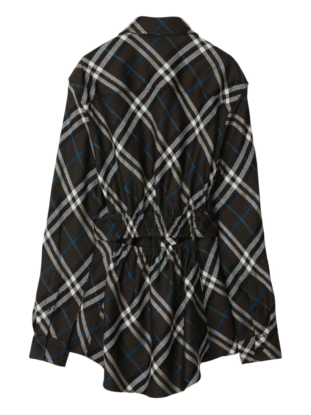 zwart wol-zijdeblend geruit taille met ceintuur elastische band aan de achterkant parelmoeren knopen knoopsluiting aan de voorkant rechte puntkraag knoopmanchetten lange mouwen afgeronde zoom