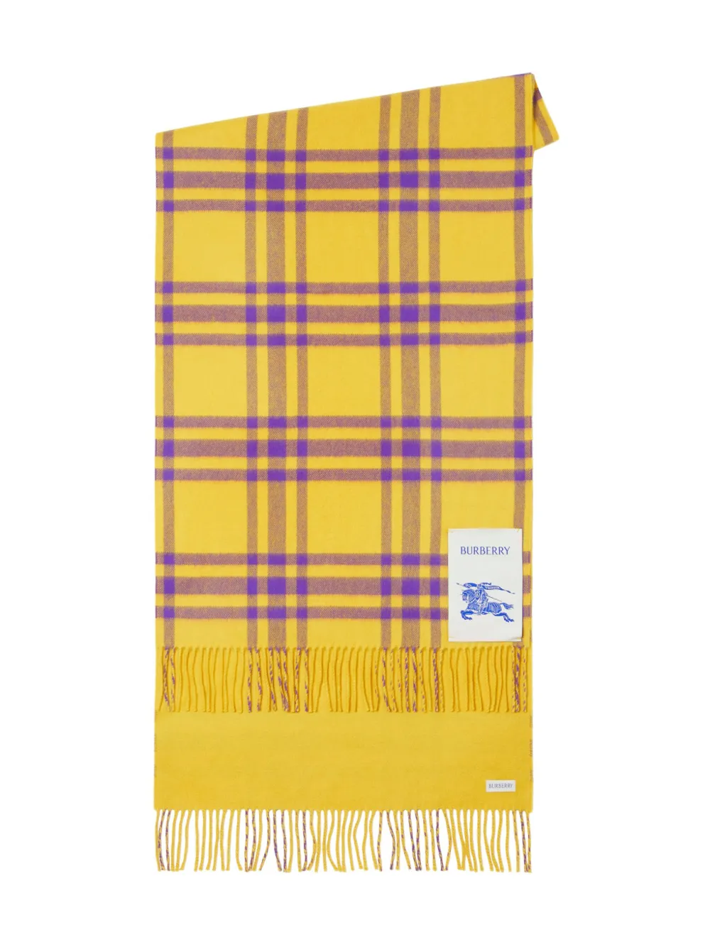 Kasjmier, ruitenprint, logopatches aan de voorkant, mini logo label, franjezoom en rechthoekige vorm.