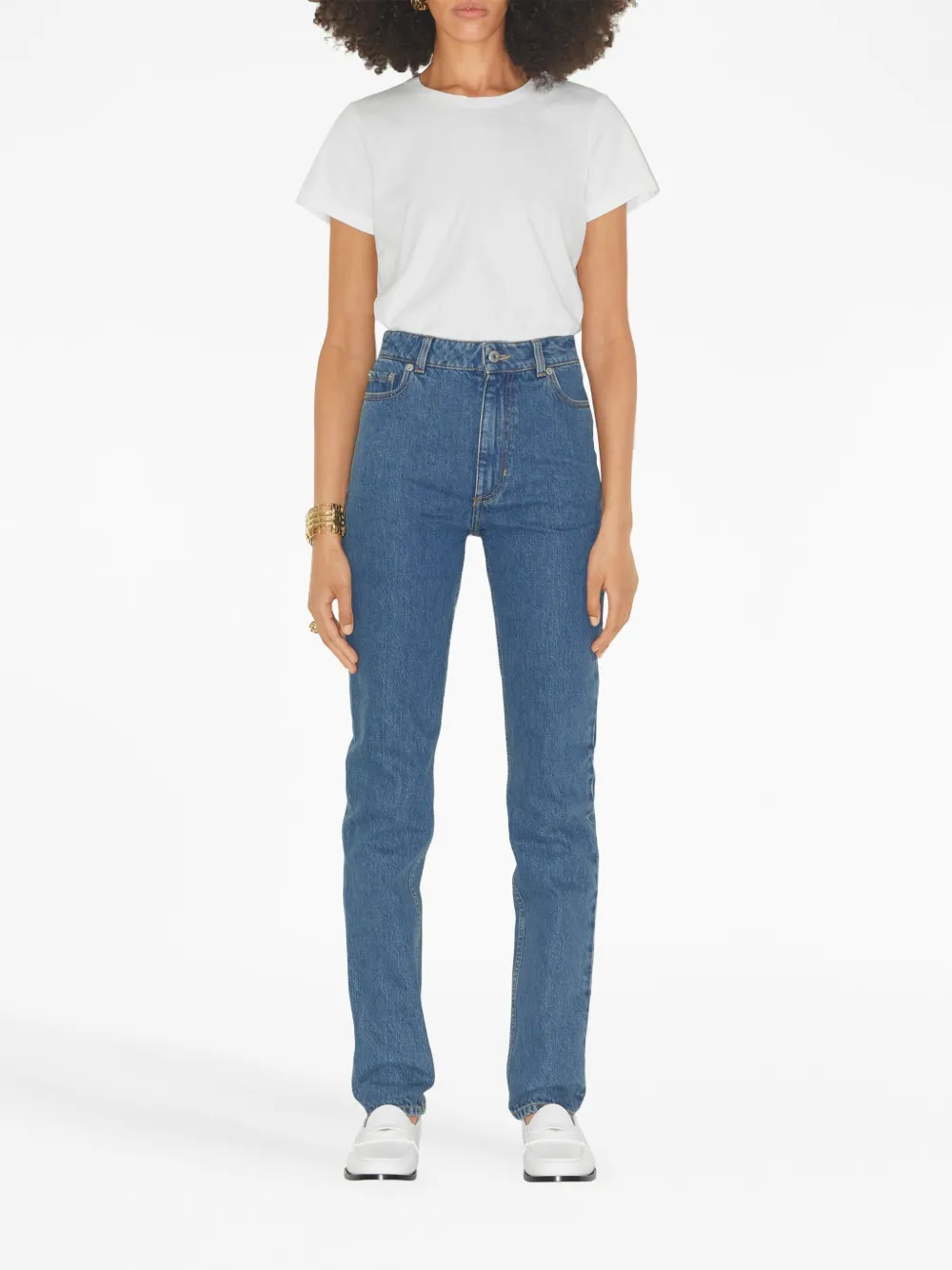Hemelsblauw, katoen, denim, contrasterende stiksels, high waist, riemlussen, verborgen gulpsluiting, traditioneel 5-zakkenmodel, logopatch aan de achterkant en slim-fit.