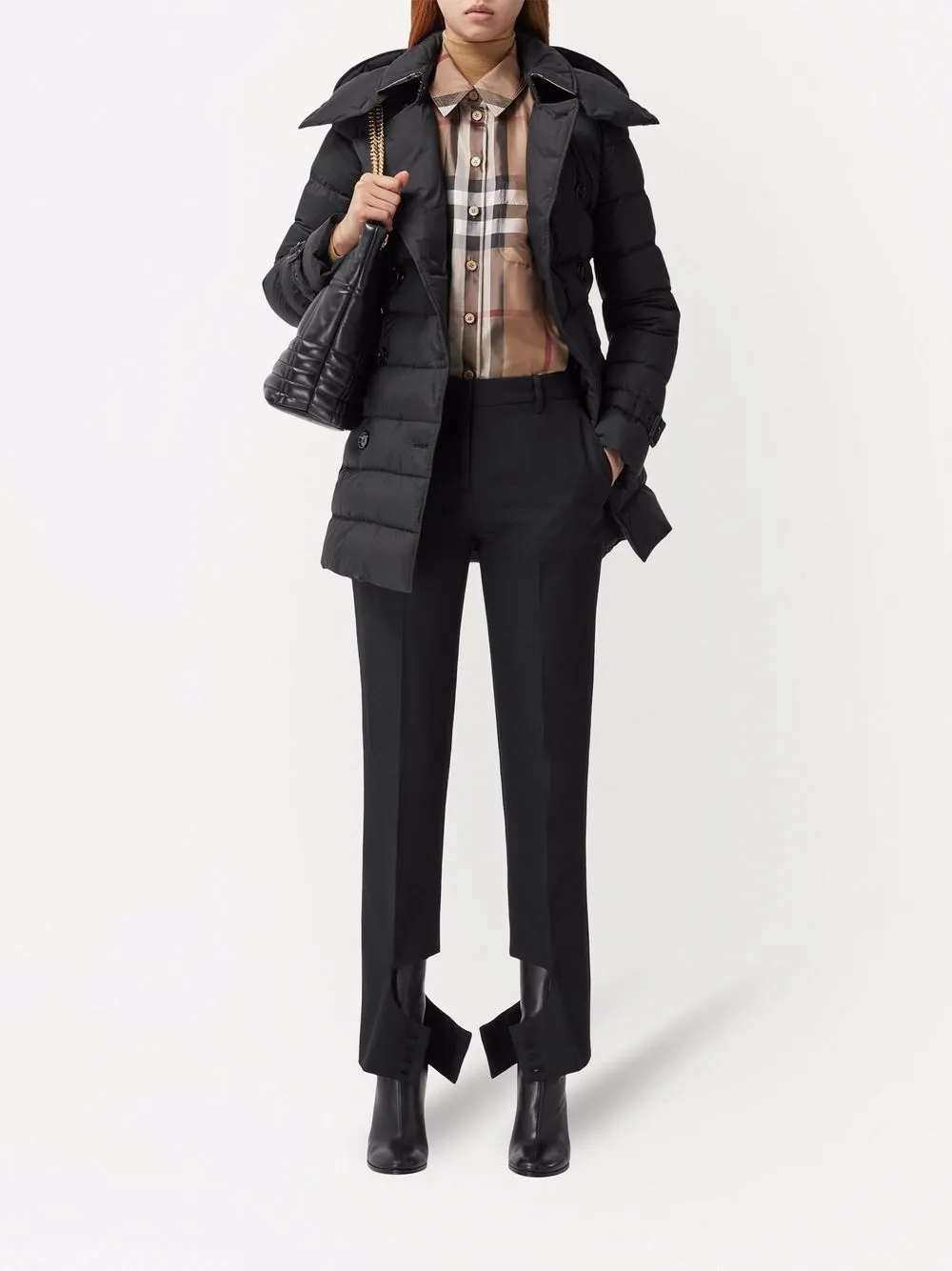 Effen design, gewatteerd design, afneembare capuchon, lange mouwen, knoopsluiting aan de voorzijde, taille met ceintuur en twee steekzijzakken.