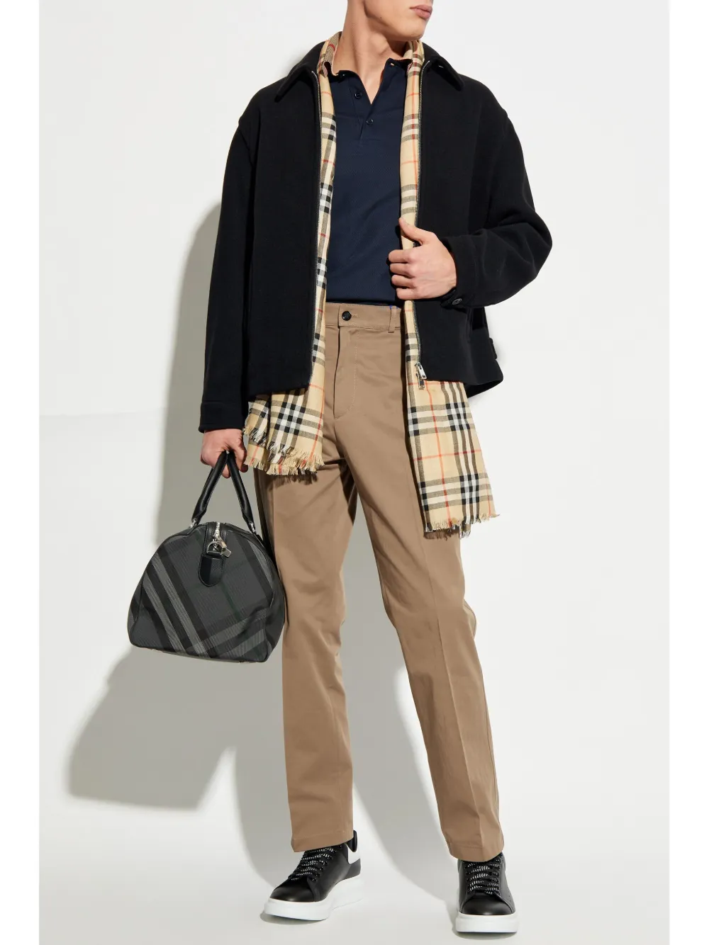 lindenbruin katoen twill weving verborgen rits- en knoopsluiting riemlussen twee steekzakken aan de zijkant geperste vouw kenmerkend Equestrian Knight borduurwerk op de achterkant paspelzak aan de achterkant volledige lengte