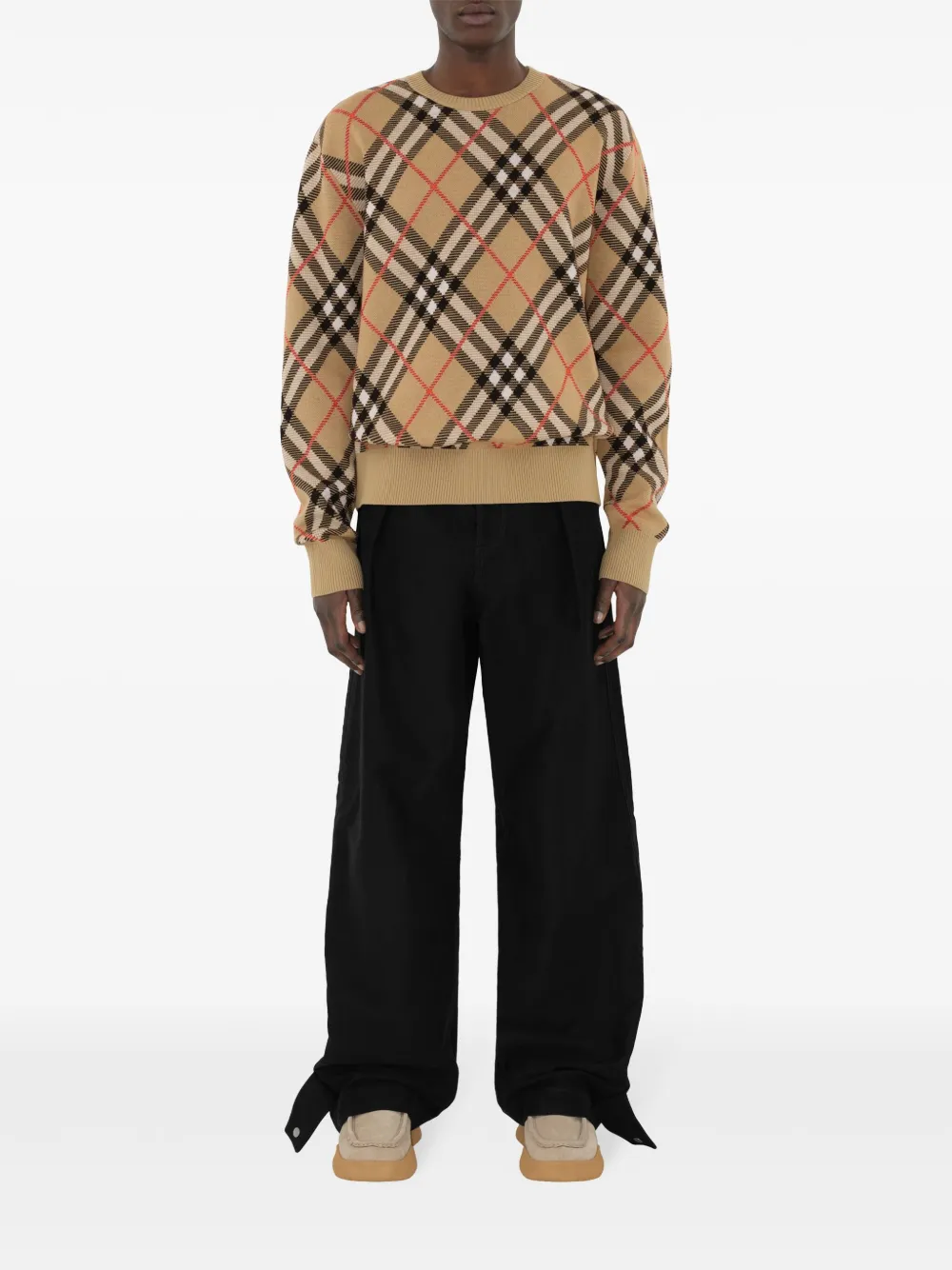 lichtbruin/veelkleurig wolblend Nova ruit geribbelde afwerking ronde hals verlaagde schouders lange mouwen rechte zoom ^