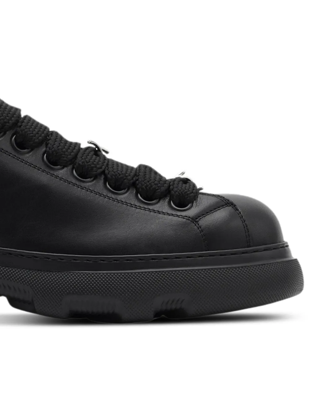 zwart kalfsleer gladde korrel vlakken decoratief prikkeldraad ronde neus veters aan voorkant binnenzool met logo zool met logo chunky zool