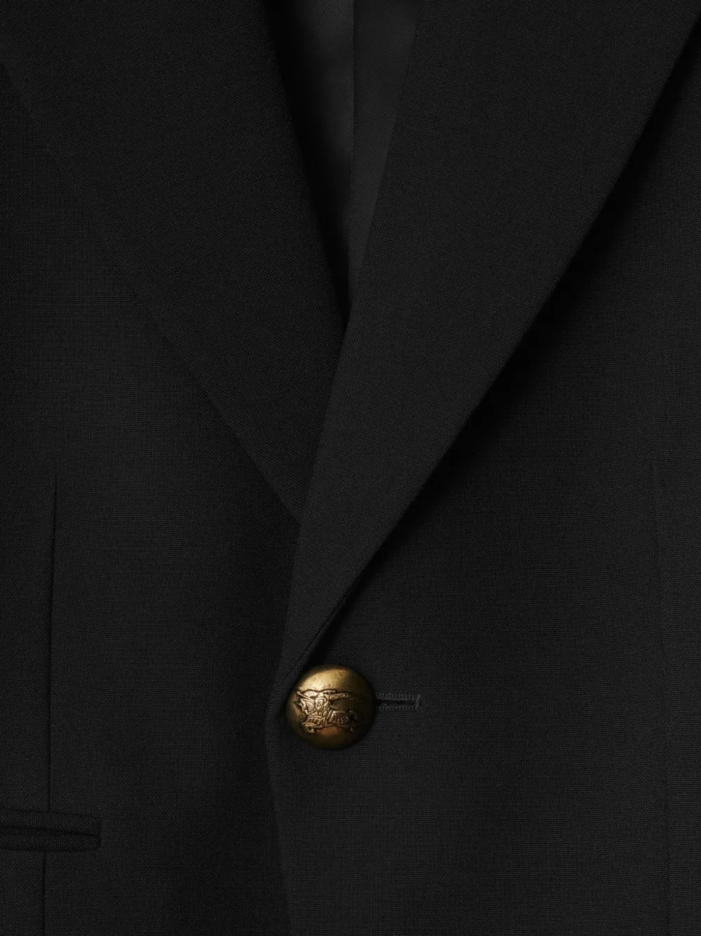 zwart knoopsluiting aan de voorkant twee paspelzakken aan de voorkant Engelse splitten aan de achterkant puntige revers