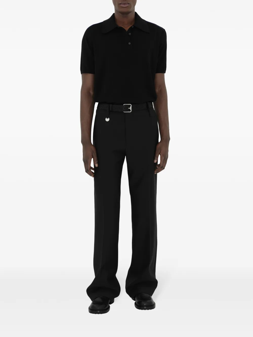 zwart wol contrasterende stiksels polokraag korte knoopsluiting aan de voorkant korte mouwen geribbelde manchetten en zoom