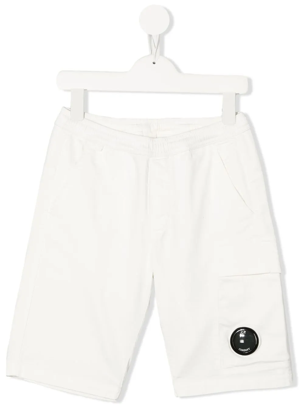Blanc, coton stretch, patch logo sur le côté, ceinture élastique, poches plaquées latérales, poche arrière passepoilée, poche latérale à rabat, coupe droite.
