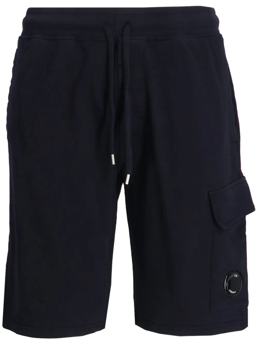 bleu nuit coton texture polaire détail verre de lunettes signature taille mi-haute taille élastique à lien de resserrage coupe droite deux poches latérales passepoilées poches cargo latérales longueur genou C.P. ^ C.P. Company suggère de retirer tout accessoire détachable avant le lavage.