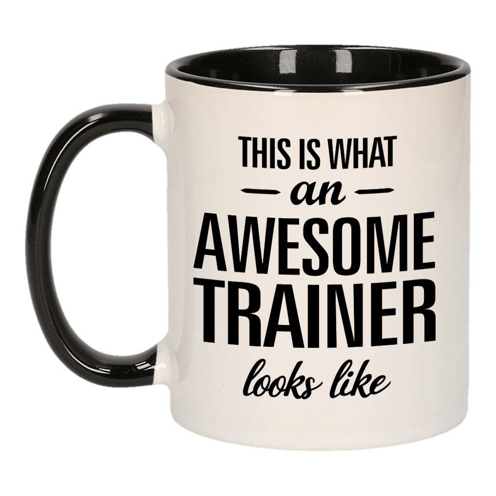 Awesome trainer of Geweldige trainer cadeau koffiemok drink beker van 300 ml. Deze beker heeft een zwarte binnenkant en een zwart oor, is magnetron- en vaatwasmachine bestendig en heeft een inhoud van 300 ml. De mok / beker is bedrukt met de tekst: This what an awesome trainer looks like. Materiaal: keramiek. Leuke mok / beker om te geven aan het eind van het sportseizoen. Hoogte: 9,5 cm. Doorsnede: 8,2 cm.