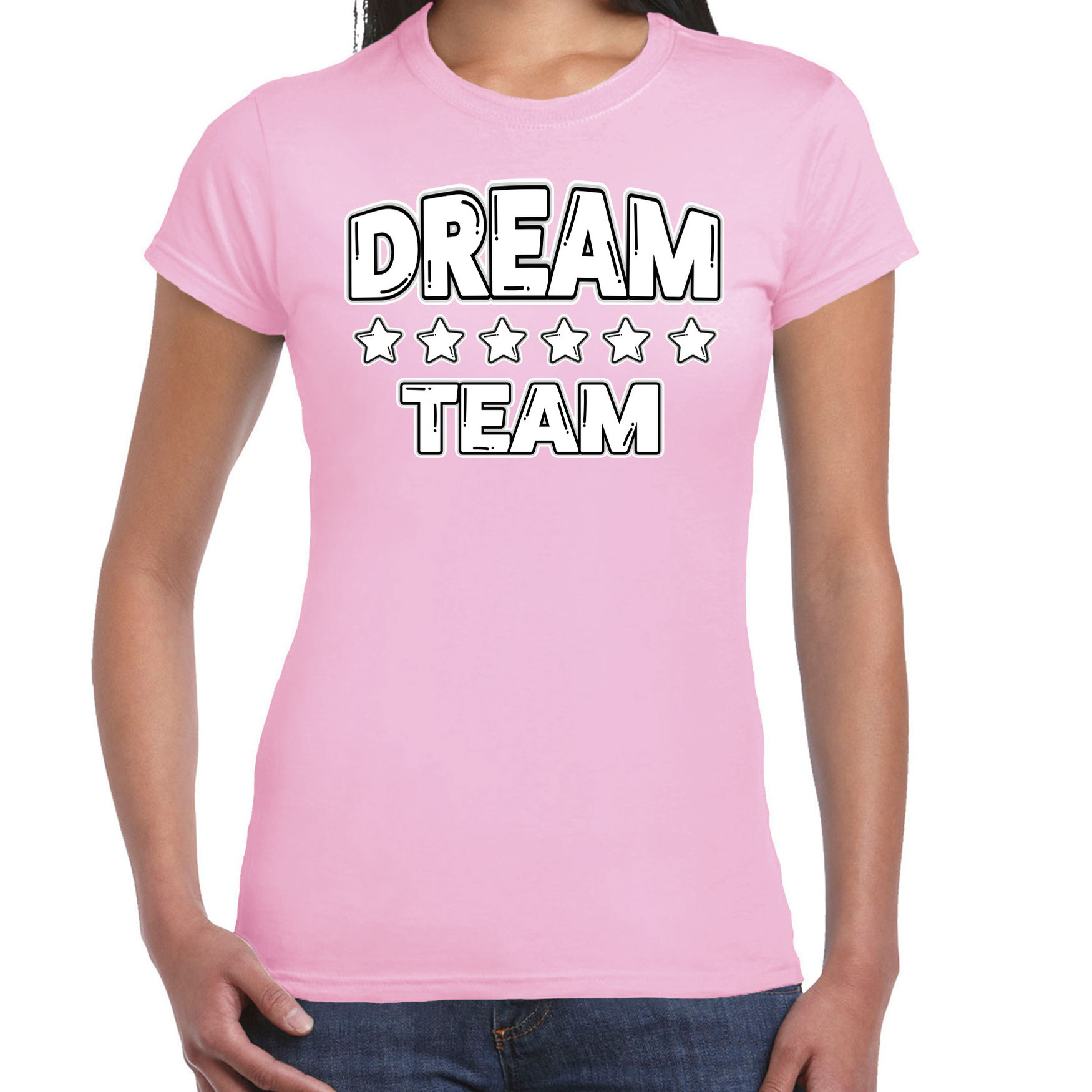 Ga voor teamspirit met het Cadeau Sport T-shirt voor dames in stijlvol licht roze! Met de opdruk “Dream Team” straalt dit T-shirt niet alleen samenwerking uit, maar ook motivatie en kracht. Ideaal voor team building, sportdagen, groepsuitjes, of gewoon als casual outfit. Til jouw team naar een hoger niveau met dit stijlvolle en comfortabele Dream Team T-shirt perfect voor sport, samenwerking en plezier! Materiaal: 145 grams, 100% katoen. Merk: Bellatio Decorations.