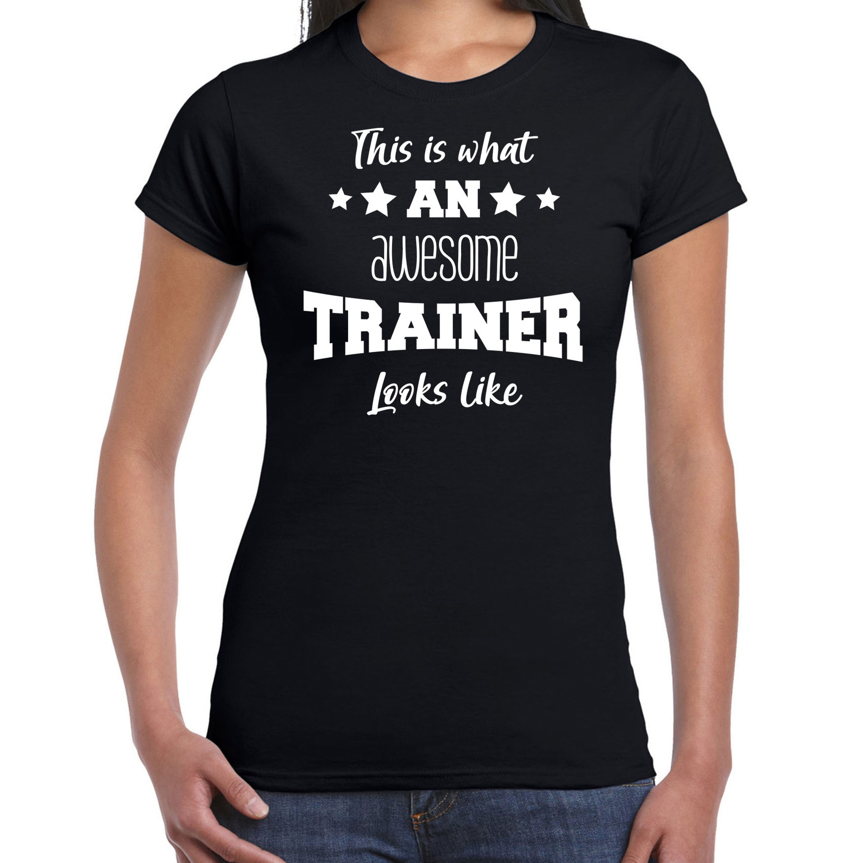 Cadeau t-shirt voor dames in de kleur zwart. Dit t-shirt is het perfecte bedankje/afscheidscadeau voor je favoriete trainer! Het kado shirt is bedrukt met de tekst: This is what an awesome trainer looks like. Geef dit kado aan je trainer aan het einde van het sport seizoen als bedankje, voor hun verjaardag of gewoon zomaar om te laten zien dat jij haar super vindt!