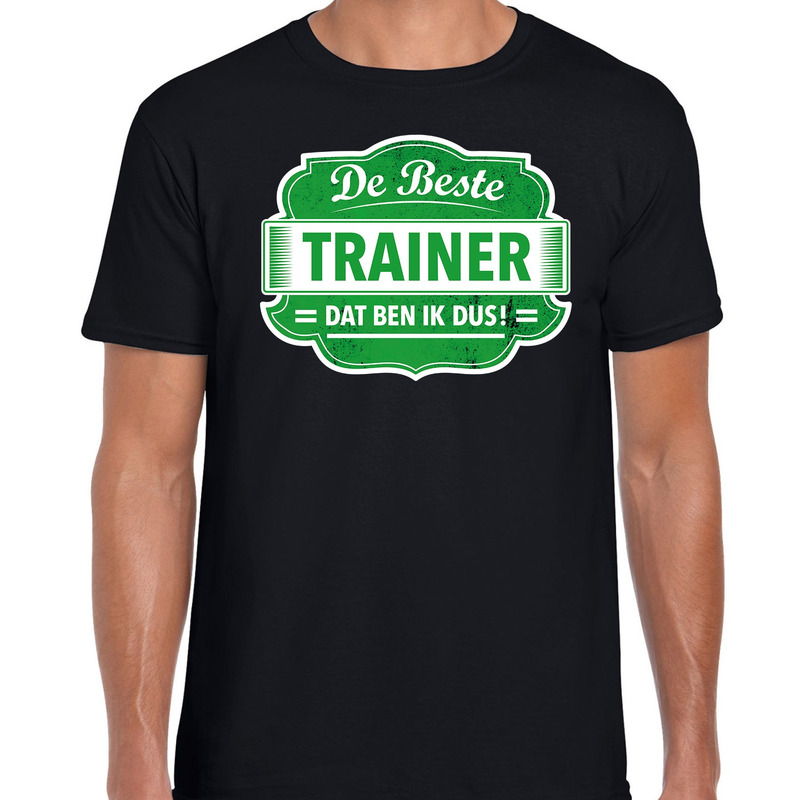 Cadeau t-shirt voor de beste trainer zwart voor heren. Dit kado shirt is bedrukt met een groen vintage bordje, waarop staat: De Beste Trainer, dat ben ik dus!