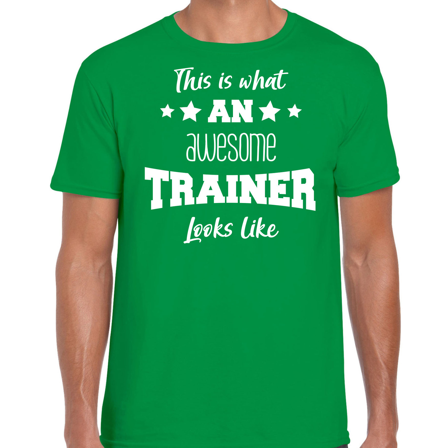 Cadeau t-shirt voor heren in de kleur groen. Dit t-shirt is het perfecte bedankje/afscheidscadeau voor je favoriete trainer! Het kado shirt is bedrukt met de tekst: This is what an awesome trainer looks like. Geef dit kado aan je trainer aan het einde van het sportseizoen of gewoon zomaar om te laten zien dat jij hem super vindt!