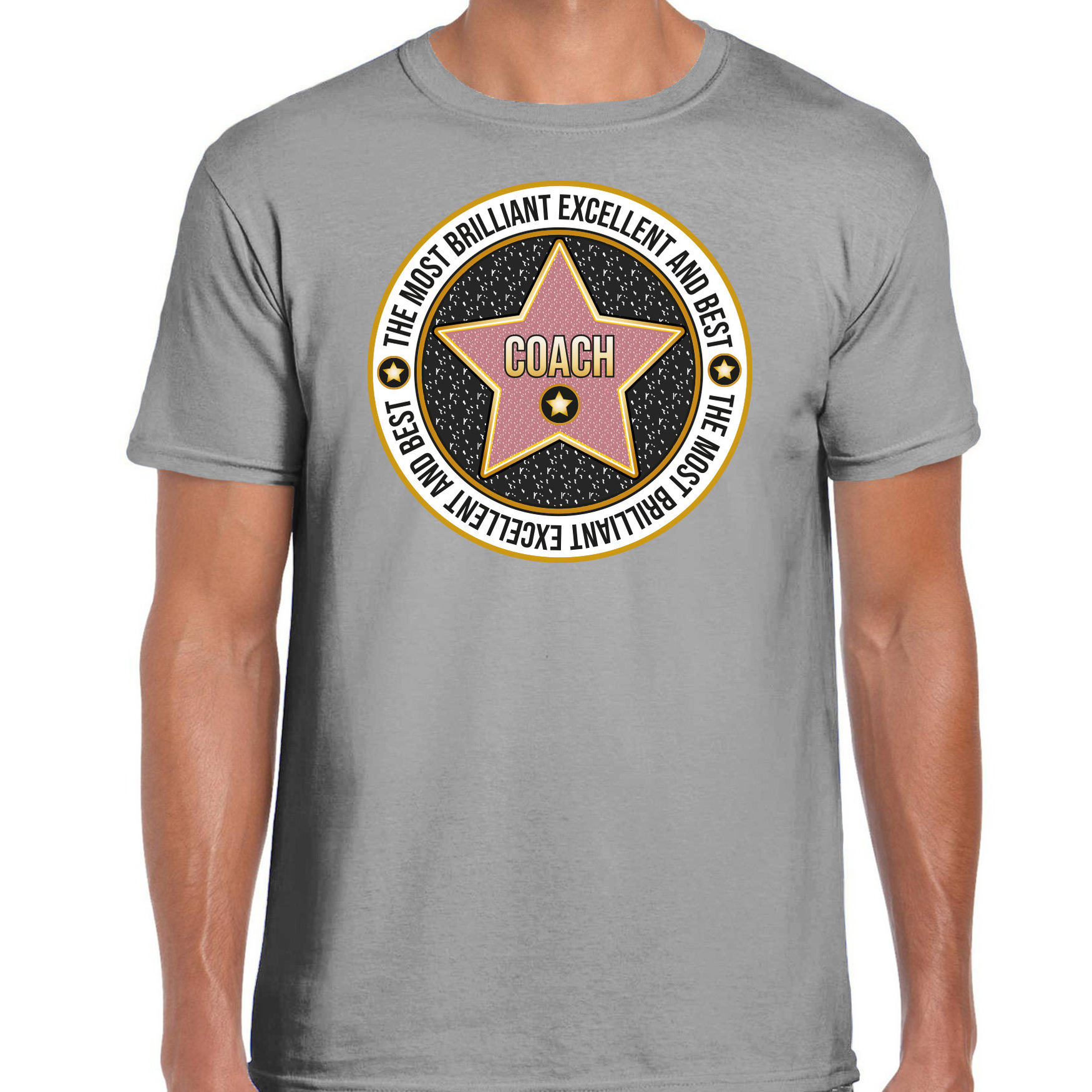 Cadeau t-shirt voor heren in de kleur grijs. Dit t-shirt is het perfecte bedankje/afscheidscadeau voor je favoriete coach! Het kado shirt is bedrukt met de tekst: The most brilliant excellent and best coach, met een tekening van een ster. Geef dit kado aan je coach aan het einde van het sport seizoen als bedankje, voor zijn verjaardag of gewoon zomaar om te laten zien dat jij hem super vindt! Materiaal: 145 grams, 100% katoen. Merk: Bellatio Decorations.