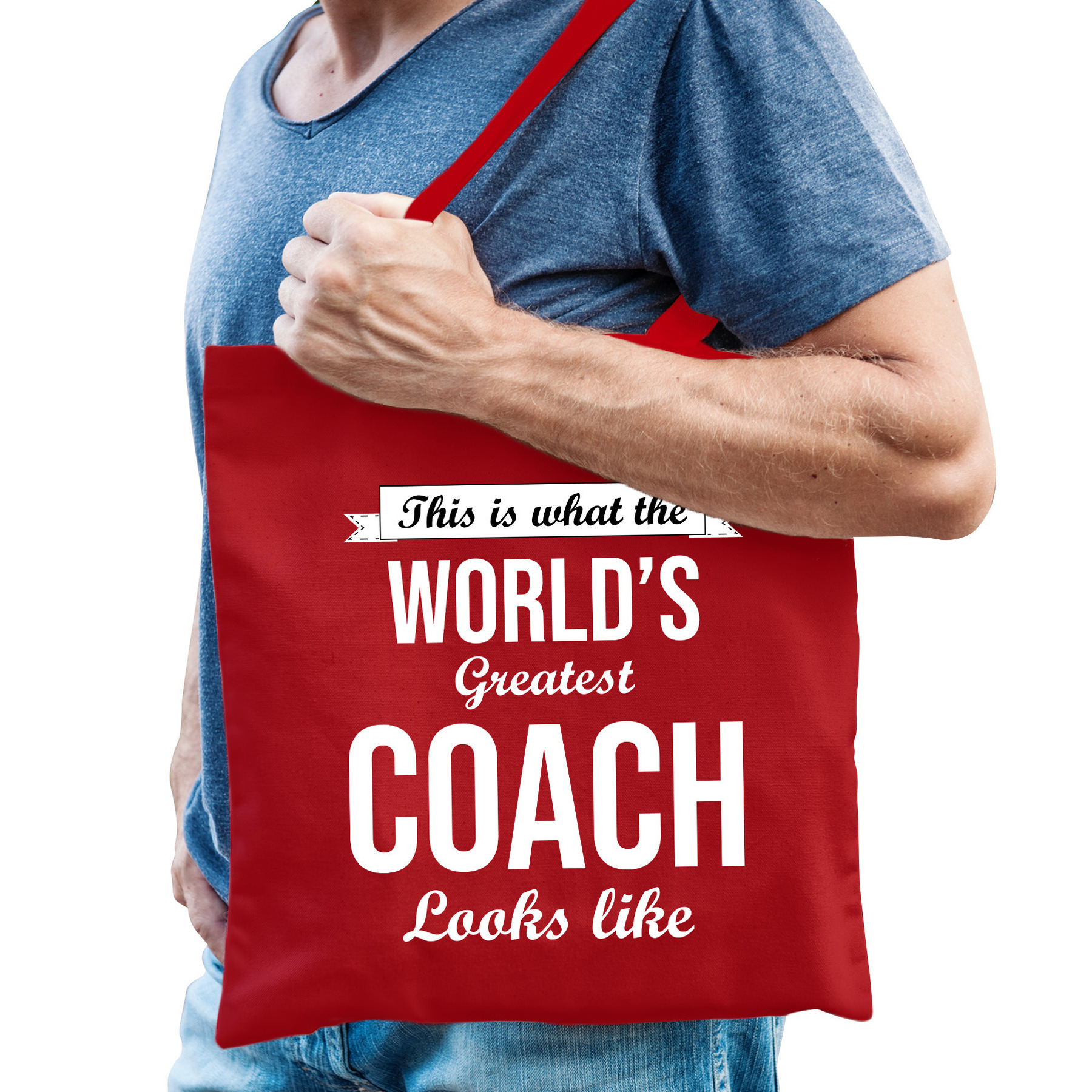 Bellatio Decorations katoenen cadeau tas/shopper/tote bag voor coach/trainers in de kleur rood. De shopper is eenzijdig bedrukt met de tekst: This is what the world’s greatest coach looks like. Verdient jouw coach wel wat waardering? Geef dan dit leuke tasje cadeau! Bijvoorbeeld aan het einde van het sportseizoen. Materiaal: 100% katoen, 140 grams kwaliteit. Formaat vak: ca. 42 x 38 cm. Totale lengte inclusief hengsel: ca. 67 cm. Inhoud: ca. 10 liter.