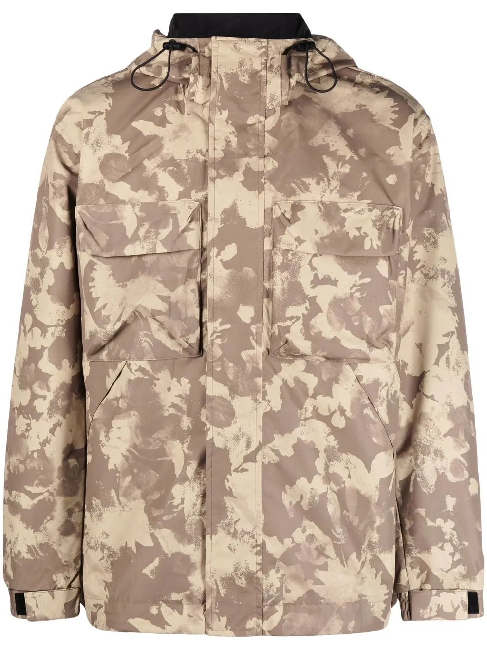 Marron, beige, imprimé abstrait, col montant, capuche à lien de resserrage, deux poches poitrine à rabat, fermeture dissimulée sur le devant, manches longues, poignets à fermeture scratch, ourlet droit.