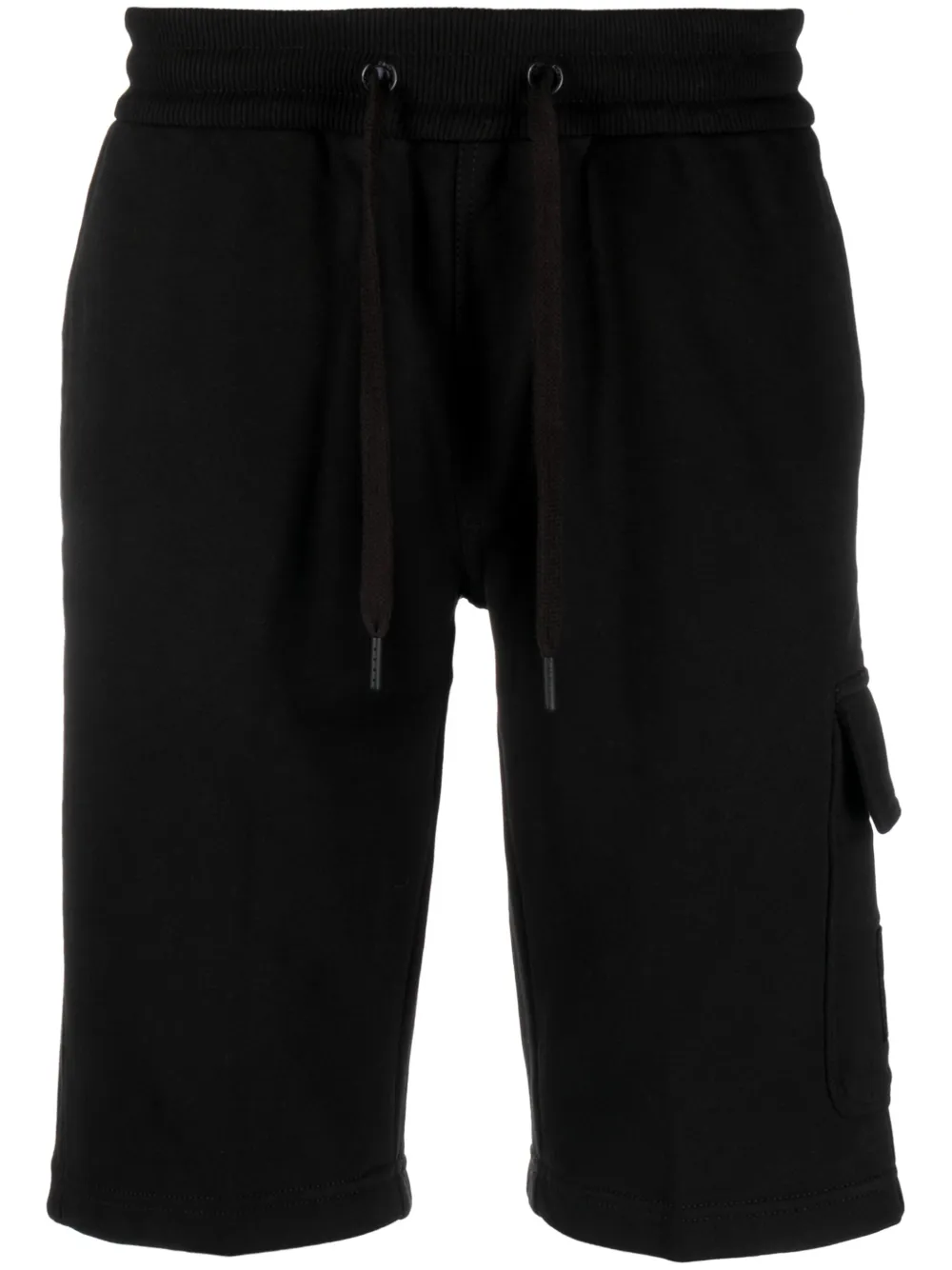 Noir, coton, patch logo sur le côté, taille élastique à lien de resserrage, poche latérale à rabat, poche arrière passepoilée.