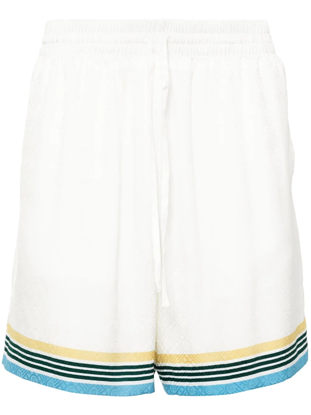 blanc/multicolore soie fini satiné motif monogrammé détails rayés imprimé graphique à l’arrière poches latérales fendues poche arrière plaquée ourlet droit doublure intégrale à enfiler taille élastique à lien de resserrage