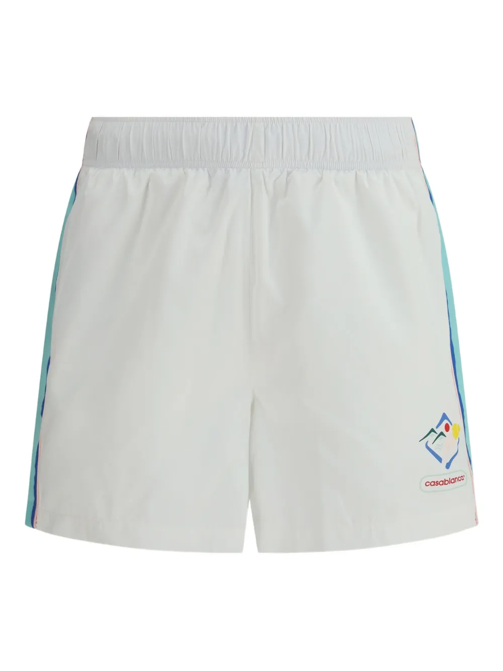 blanc cassé empiècements latéraux imprimé graphique ceinture élastique logo brodé poche arrière
