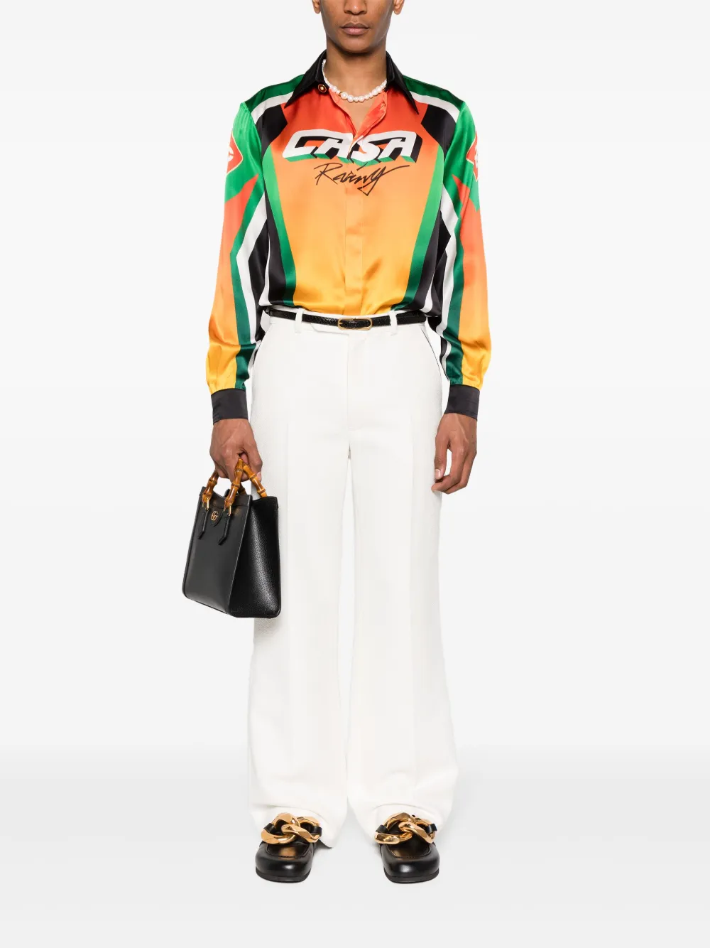 oranje/veelkleurig zijde satijnen afwerking geometrisch patroon logoprint op de voorkant puntige platte kraag verborgen knoopsluiting aan de voorkant verlaagde schouders lange mouwen met manchetten met knopen rechte zoom Als je dit uniseks item wilt kopen, wees je ervan bewust dat het matensysteem voor heren wordt gebruikt.